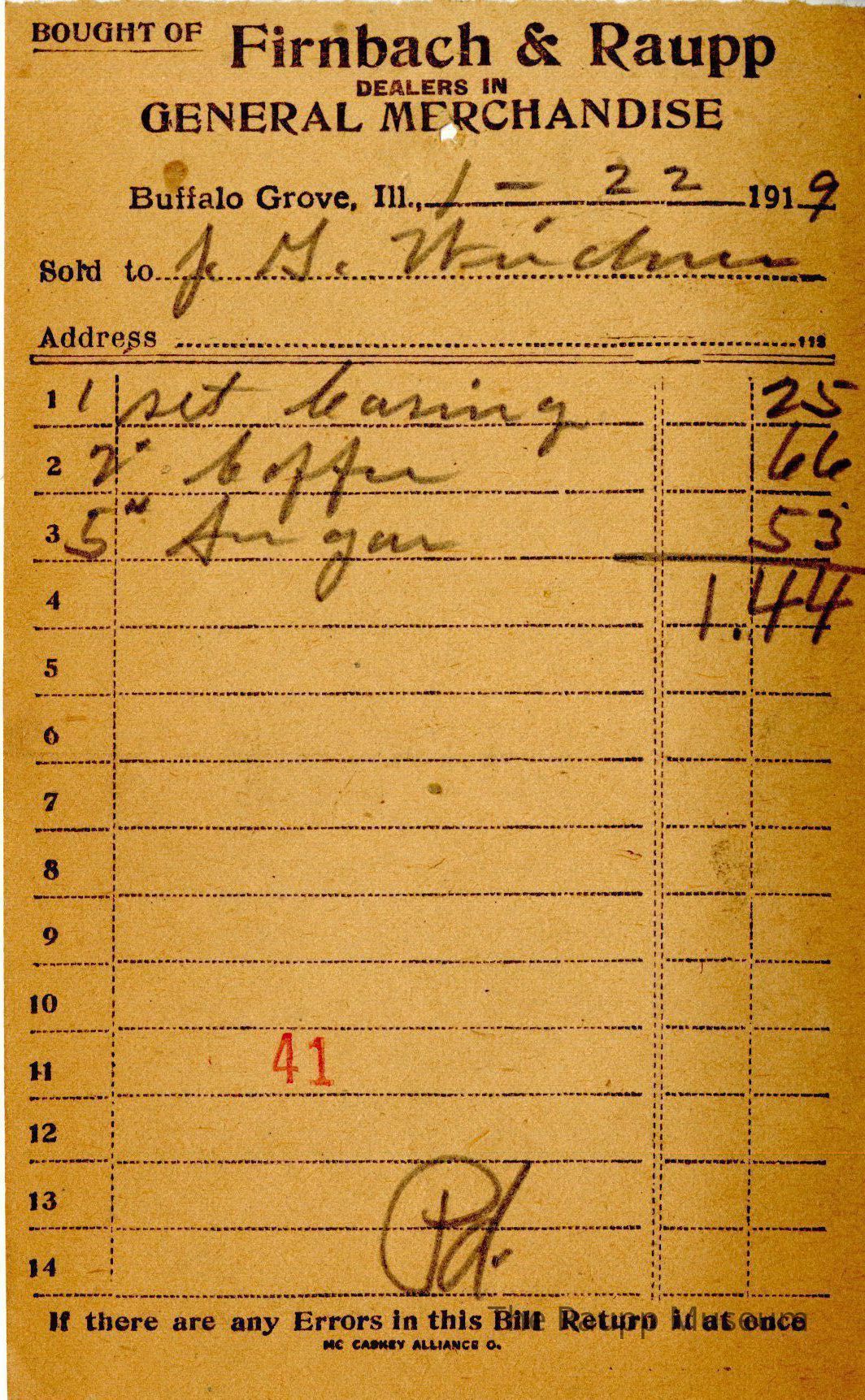 The black text is as follows, from top to bottom: "Bought of Firnbach and Raupp: Dealers in GENERAL MERCHANDISE; Buffalo Grove , Ill.; Sold to; Address; If there are any Errors in this Bill Return it at once; MC CASKEY ALLIANCE O."Archive Details