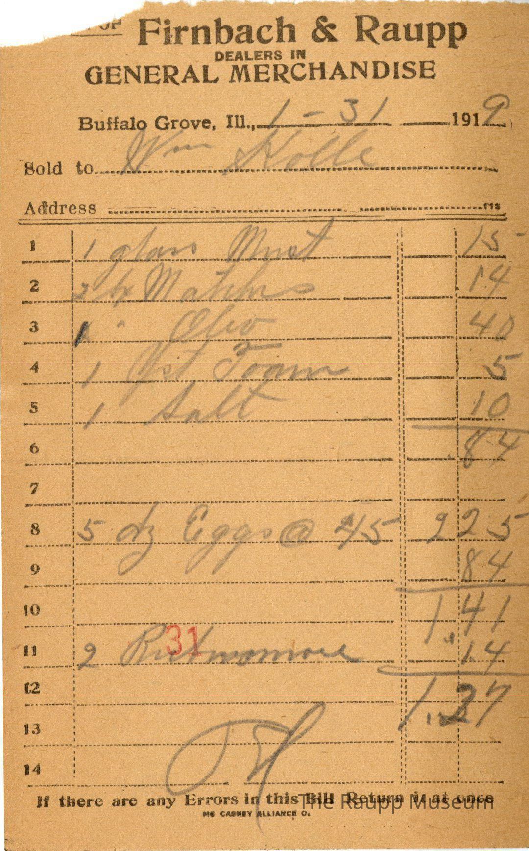 One (1) Firnbach and Raupp store receipt from January 31st, 1919. Receipt is rectangular with black printed text and handwritten notes in pencil. Receipt is for William Kolle who bought 1 glass myst(?) for $0.15, 2 packs of matches for $0.14, 1 Oleo (?)for $0.40, 1 yeast foam for $0.05, 1 pack of salt for $0.10, sold 5 dozens eggs at $0.45 each, total being $2.25, sold 2 Rubnomores at $1.41. The bill total was $1.27. They paid $1.27 by cash. The bill was marked as paid. There is a red stamp of "31".