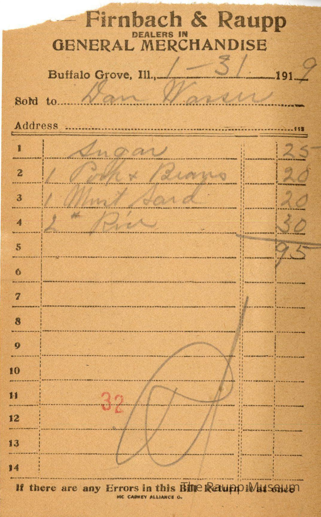 The black text is as follows, from top to bottom: "Bought of Firnbach and Raupp; Dealers in GENARL MERCHANDISE; Buffalo Grove, Ill; Sold to; Address; if there are any Errors in this Bill Return it at once; MC CASKEY ALLIANCE O;Archive Details