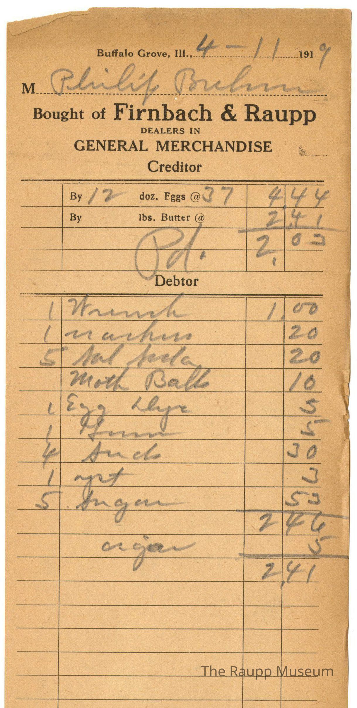 One (1) Firnbach and Raupp store receipt from April 11, 1919. Receipt is rectangular with black printed text and handwritten notes in pencil. The receipt is for Philip Brehm, who sold 12 doz. eggs @ $0.37 per dozen, and bought 1 wrench for $1.00, 1 crackers(?) for $0.20, 5 sal(?) soda for $0.20, moth balls for $0.10, 1 egg dye for $0.05, 1 gum for $0.05, 4 seeds for $0.30, 1 yeast for $0.03, 5 sugar for $0.53, 1 cigar for $0.05. Bill Total was $2.41 but the store owed $4.44 for the eggs so they paid him $2.03. The bill is marked as paid.