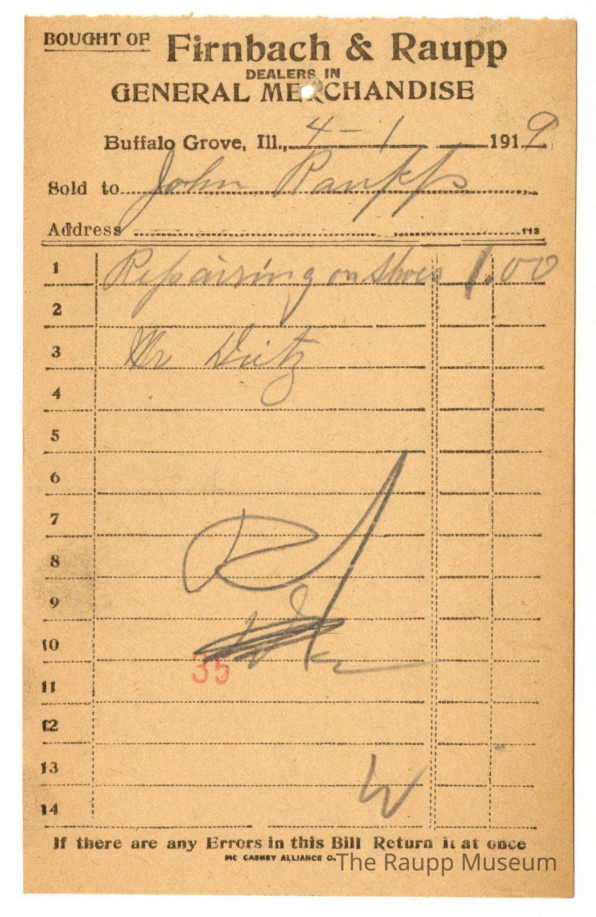 One (1) Firnbach and Raupp store receipt from April 1, 1919. Receipt is rectangular with black printed text and handwritten notes in pencil. The receipt is for John Raupp who bought repairing of shoes for $1.00 which was done by Mr. Huitz(?). Bill total was $1.00 and is marked as paid. There is a red stamp of 35 close to the bottom.