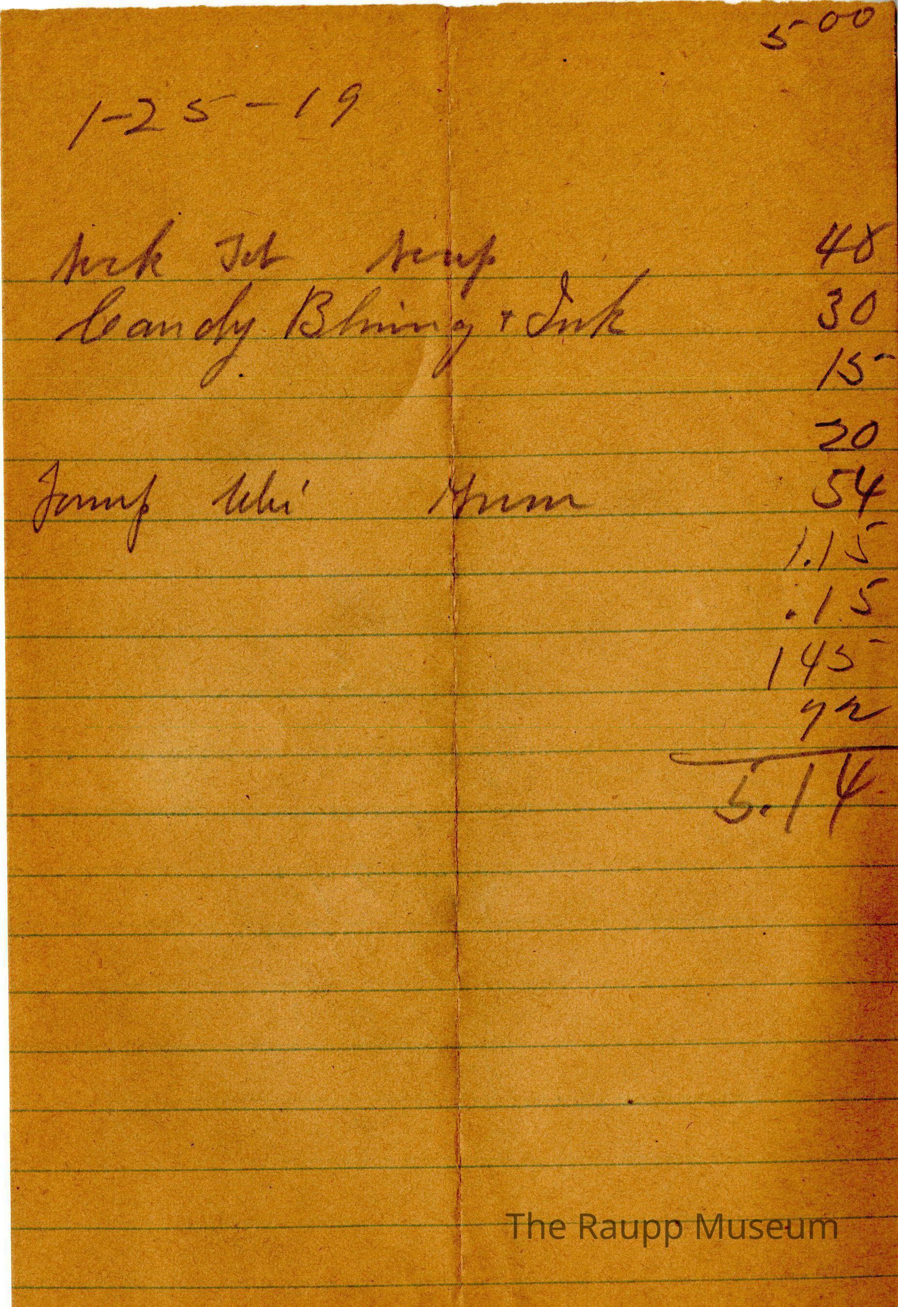 One (1) Firnbach and Raupp store receipt from January 25th, 1919. Receipt is rectangular with handwritten notes in pencil. The receipt does not indicate who it is for. They bought soap, tab, Candy, syrup, and other unknown items. Bill total was $5.14.