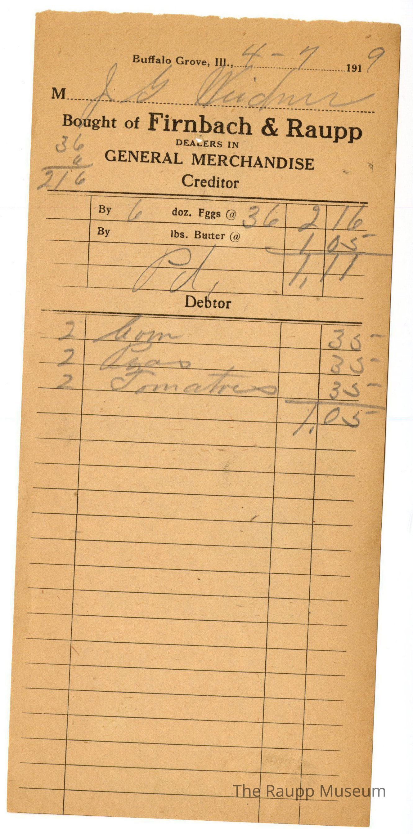 The black text is as follows, from top to bottom: Buffalo Grove, Ill. ; Bought of Firnbach and Raupp: Dealers in GENERAL MERCHANDISE; Creditor; By, doz. Eggs @; By, lbs. Butter @; Debtor"Archive Details