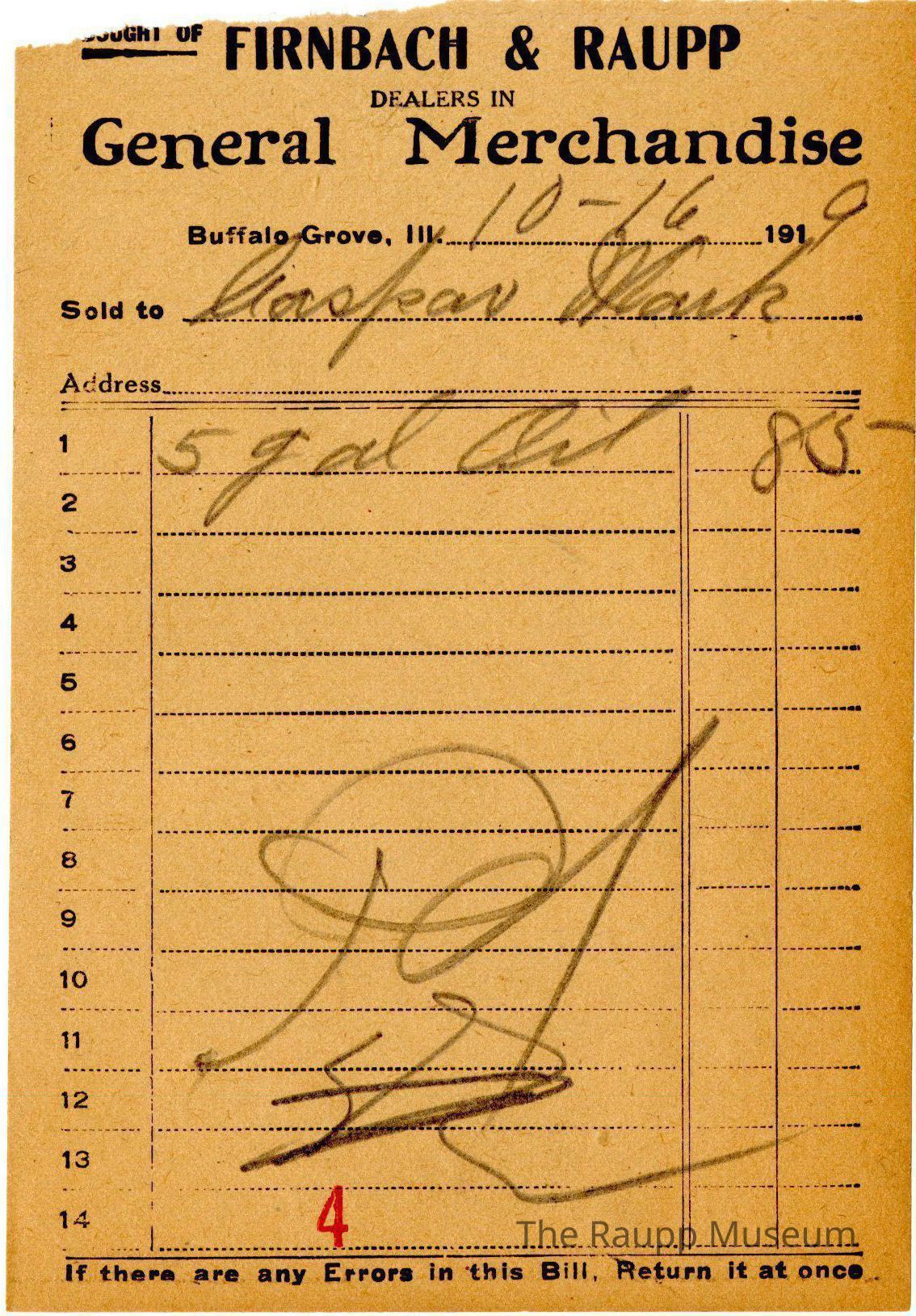 One (1) Firnbach and Raupp store receipt from October 16, 1919. Receipt is rectangular with black printed text and written notes in pencil. The receipt is for (?) Mauk(?), who bought, 5 gallons of Oil for $0.85 . The bill total was $0.85. There's a red stamp of an 4 close to the bottom, with the bill marked as paid.