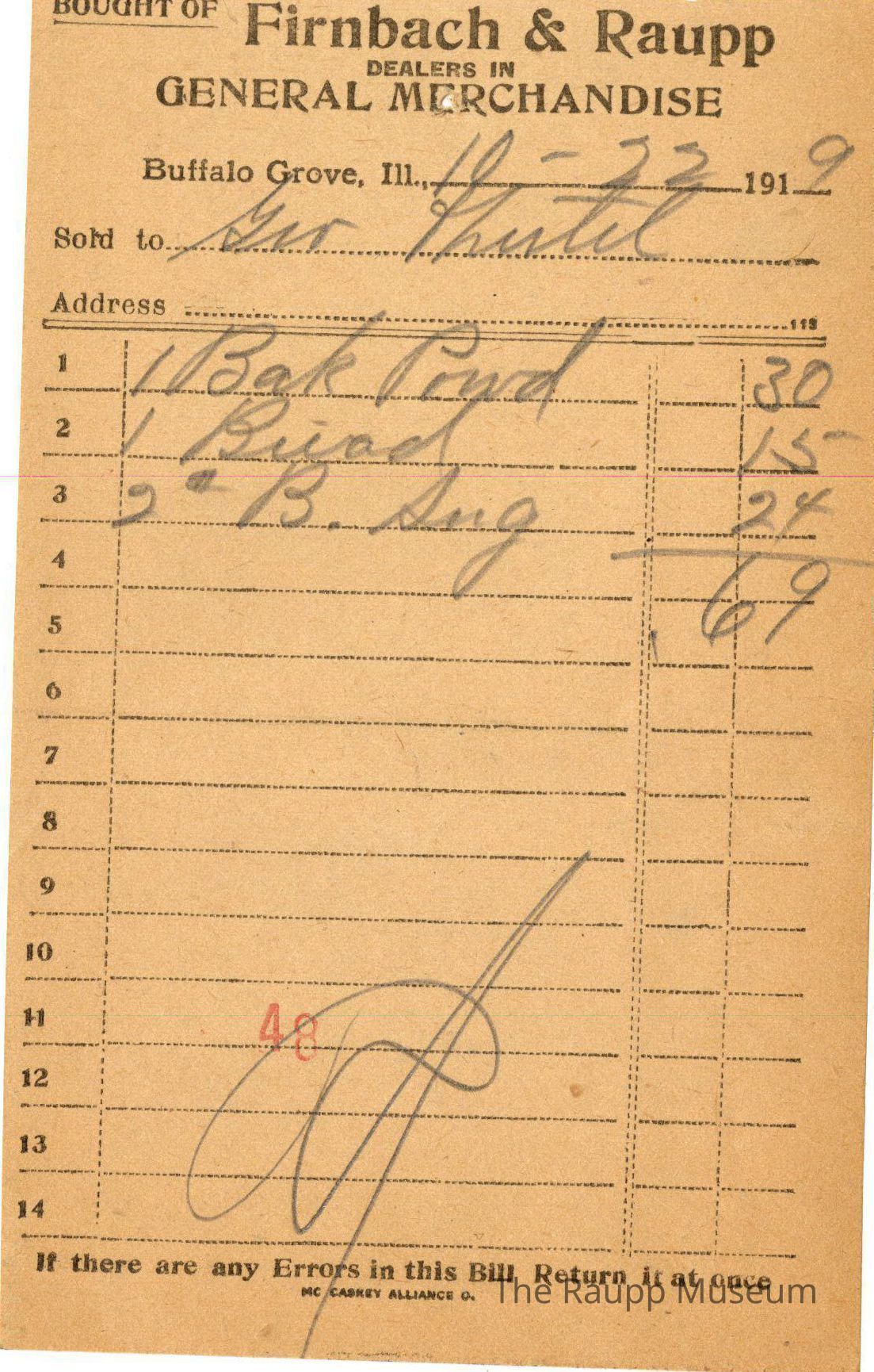 The black text is as follows, from top to bottom: Bought of Firnbach & Raupp; Dealers in GENERAL MECHANDISE; Buffalo Grove, Ill.; Sold to; Address; if there are any Errors in this Bill Return it at once; MC CASKEY ALLIANCE O.Archive Details