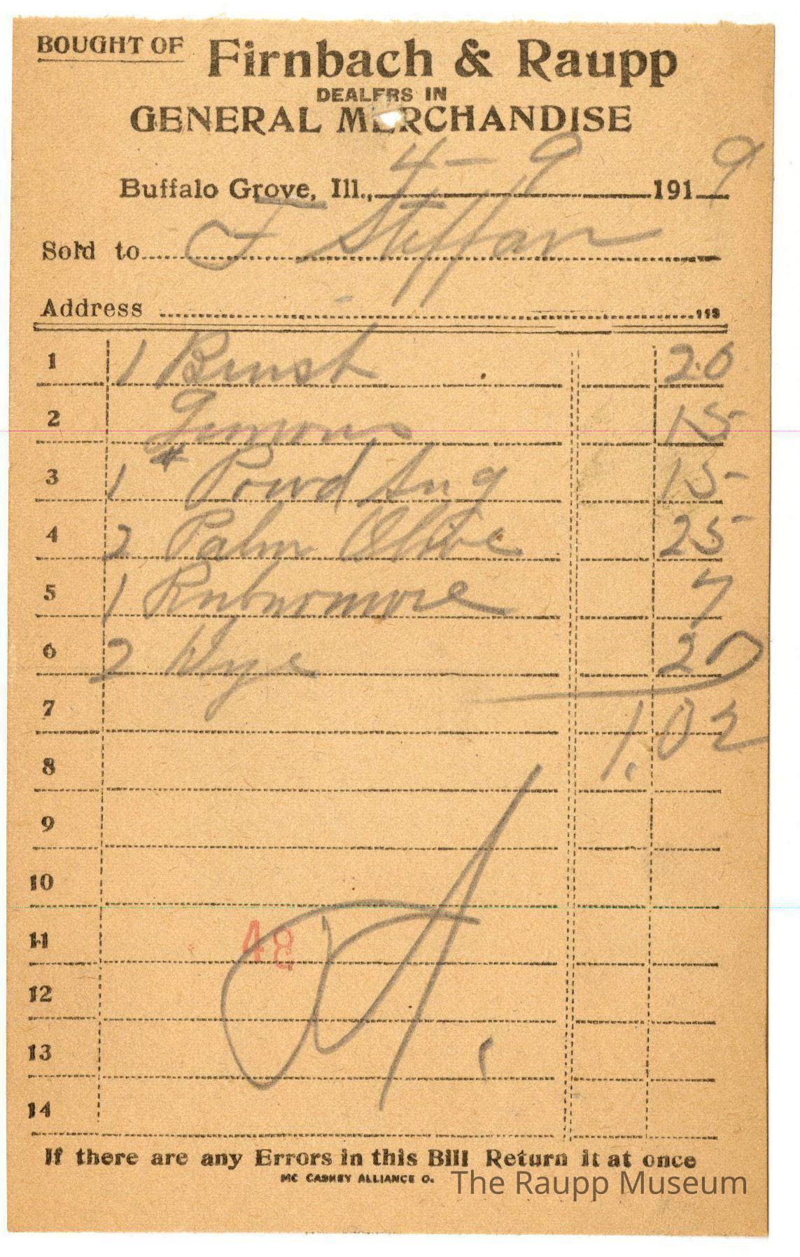 One (1) Firnbach and Raupp store receipt from April 9, 1919. Receipt is rectangular with black printed text and handwritten notes in pencil. The receipt is for F. Steffan who bought 1 brush for $0.20, Lemons for $0.15, 1 pound powdered sugar for $0.15, 2 palm olive for $0.25, 1 rush no more for $0.07, and 2 dye for $0.20 . Bill total was $1.02 and is marked as paid. There is a red stamp of 48 close to the bottom.