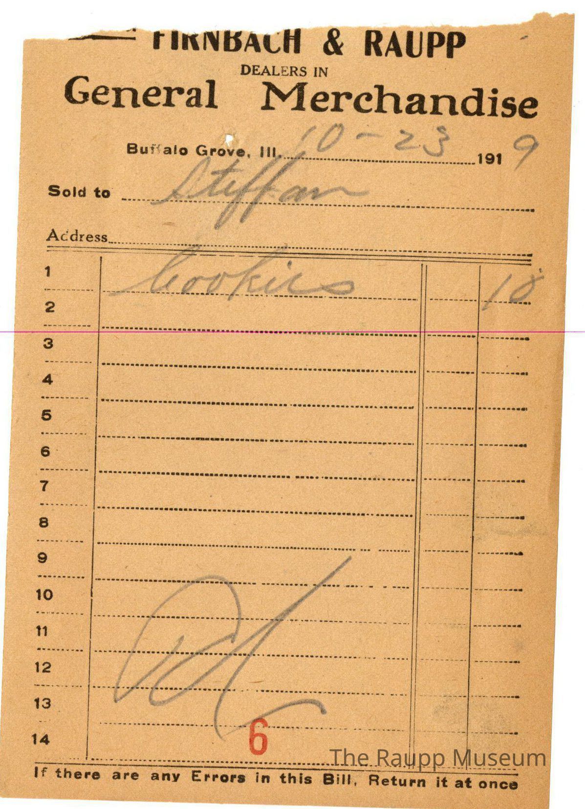 The black text is as follows, from top to bottom: Bought of Firnbach & Raupp; Dealers in GENERAL MECHANDISE; Buffalo Grove, Ill.; Sold to; Address; if there are any Errors in this Bill, Return it at once.Archive Details