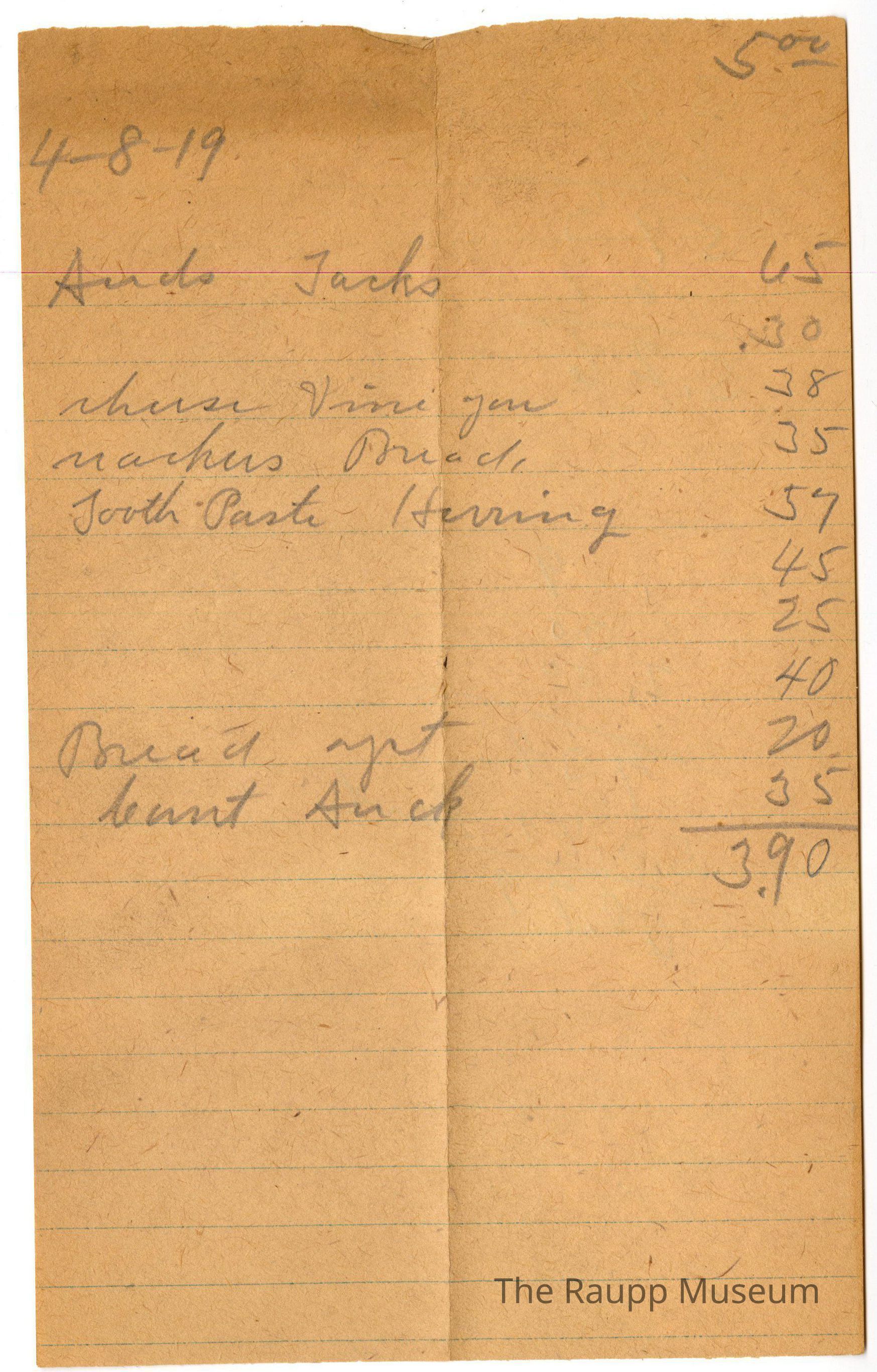 One (1) Firnbach and Raupp store receipt from April 8, 1919. Receipt is rectangular with handwritten notes in pencil. The receipt does not indicate who it is for. They bought seeds and tacks for $0.65, (?) for $0.30, cheese and vinegar for $0.38. matches and bread for $0.35, tooth paste and herring for $0.54, (?) for $0.45, (?) for $0.25, (?) for $0.40, bread and yeast for $0.20, (?) and seeds(?) for $0.35. Bill total was $3.90.Archive Details