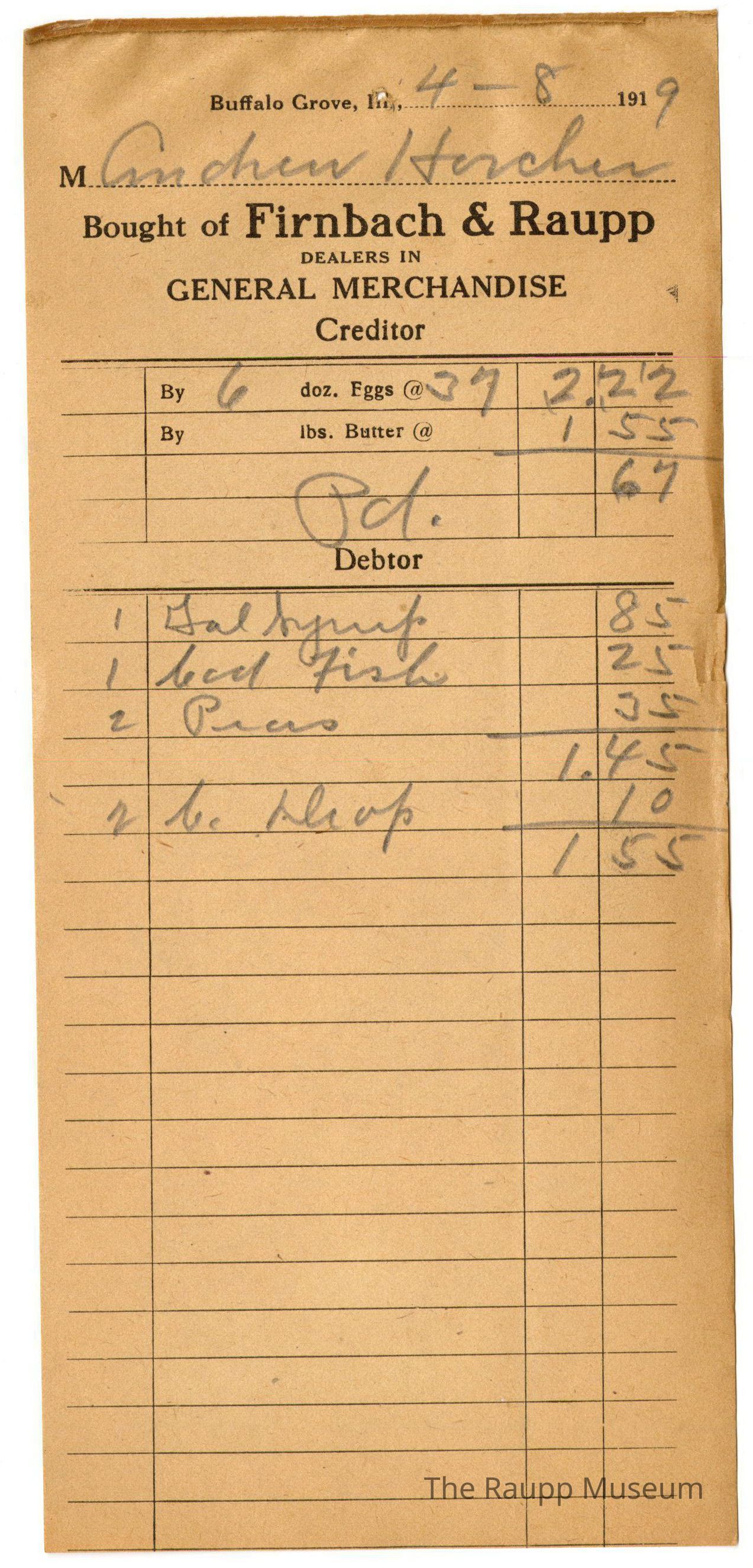 One (1) Firnbach and Raupp store receipt from April 8, 1919. Receipt is rectangular with black printed text and handwritten notes in pencil. The receipt is for Andrew Horcher, who sold 6 doz. eggs @ $0.37 per dozen, and bought 1 gal syrup for $0.85, 1 cod fish for $0.25, 2 peas for $0.35, 2 (?) for $0.10. Bill Total was $1.55 but the store owed $2.22 for the eggs so they paid him $0.67. The bill is marked as paid.