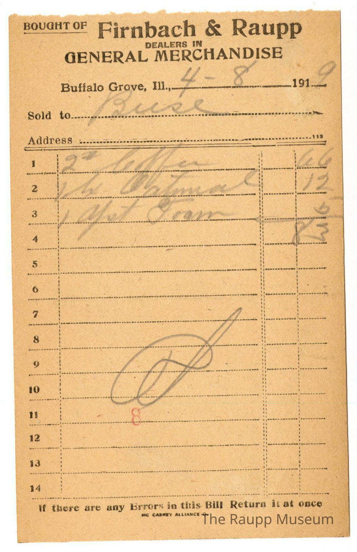 The black text is as follows, from top to bottom: "Bought of Firnbach and Raupp: Dealers in GENERAL MERCHANDISE; Buffalo Grove , Ill.; Sold to; Address; If there are any Errors in this Bill Return it at once; MC CARNEY ALLIANCE O."Archive Details