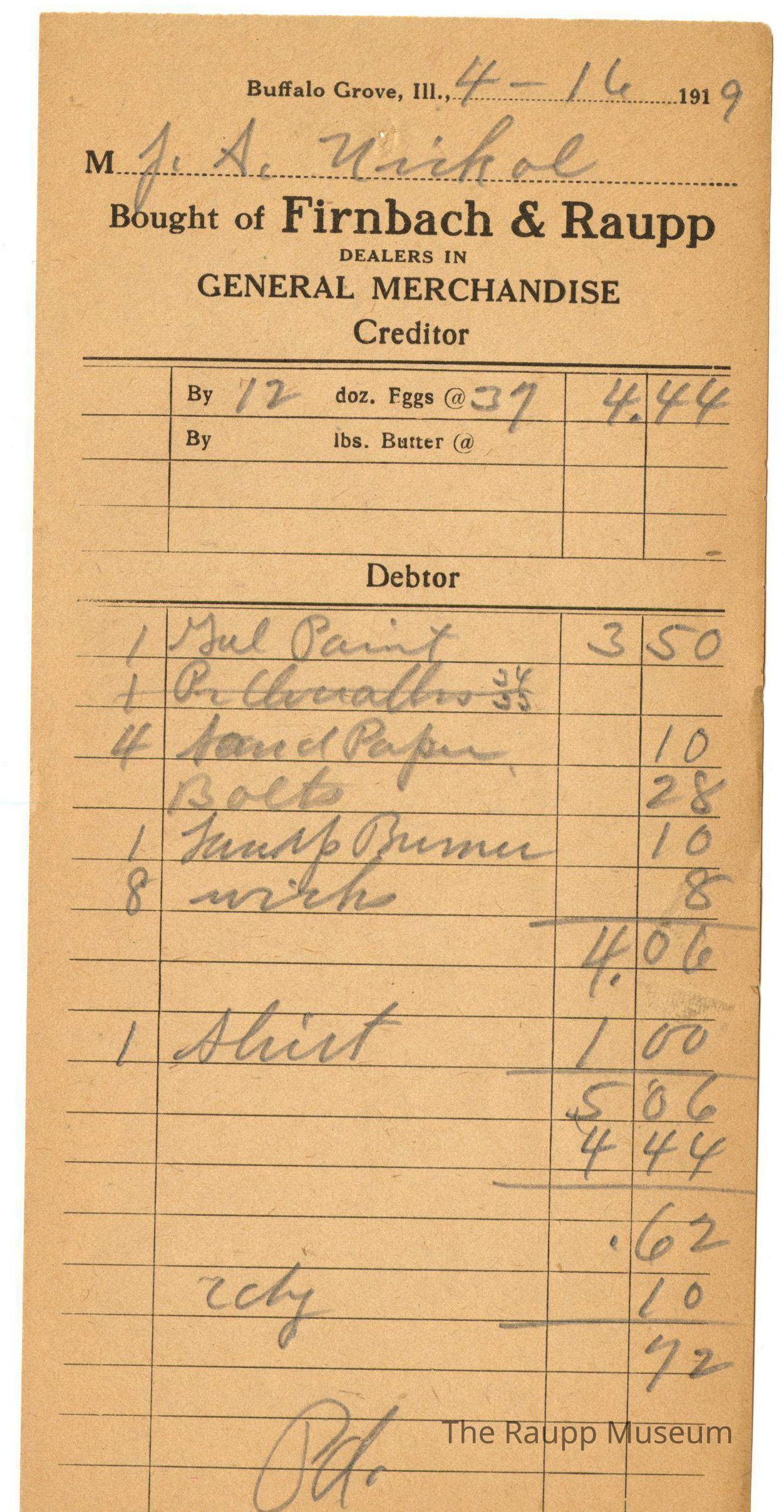 One (1) Firnbach and Raupp store receipt from April 16, 1919. Receipt is rectangular with black printed text and handwritten notes in pencil. The receipt is for J.S. Nickol, who sold 12 doz. eggs @ $0.37 per dozen, and bought 1gal paint for $3.50, 4 sand paper for $0.10, bolts for $0.28, 1 lamp burner for $0.10, 8 wicks for $0.08, 1 shirt for $1.00, candy for $0.10. Bill Total was $5.16 but the store owed $4.44 for the eggs so the new total was $0.72. The bill is marked as paid.