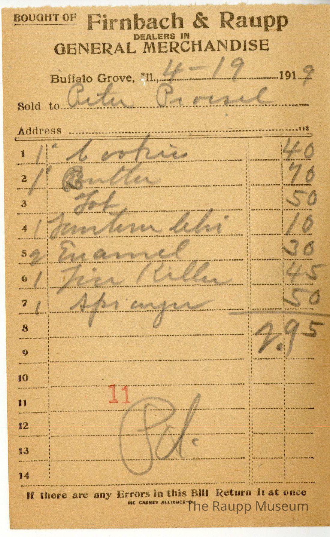 One (1) Firnbach and Raupp store receipt from April 19, 1919. Receipt is rectangular with black printed text and handwritten notes in pencil. The receipt is for Peter Prousel who bought 1 pound cookies for $0.40, 1 pound butter for $0.70, tab for $0.50, 1 lantern chi(?) for $0.10, 2 Enamel(?) for $0.30, 1 lice killer for $0.45, 1 sprayer for $0.50. Bill total was $2.95 and is marked as paid. There is a red stamp of 11 close to the bottom.