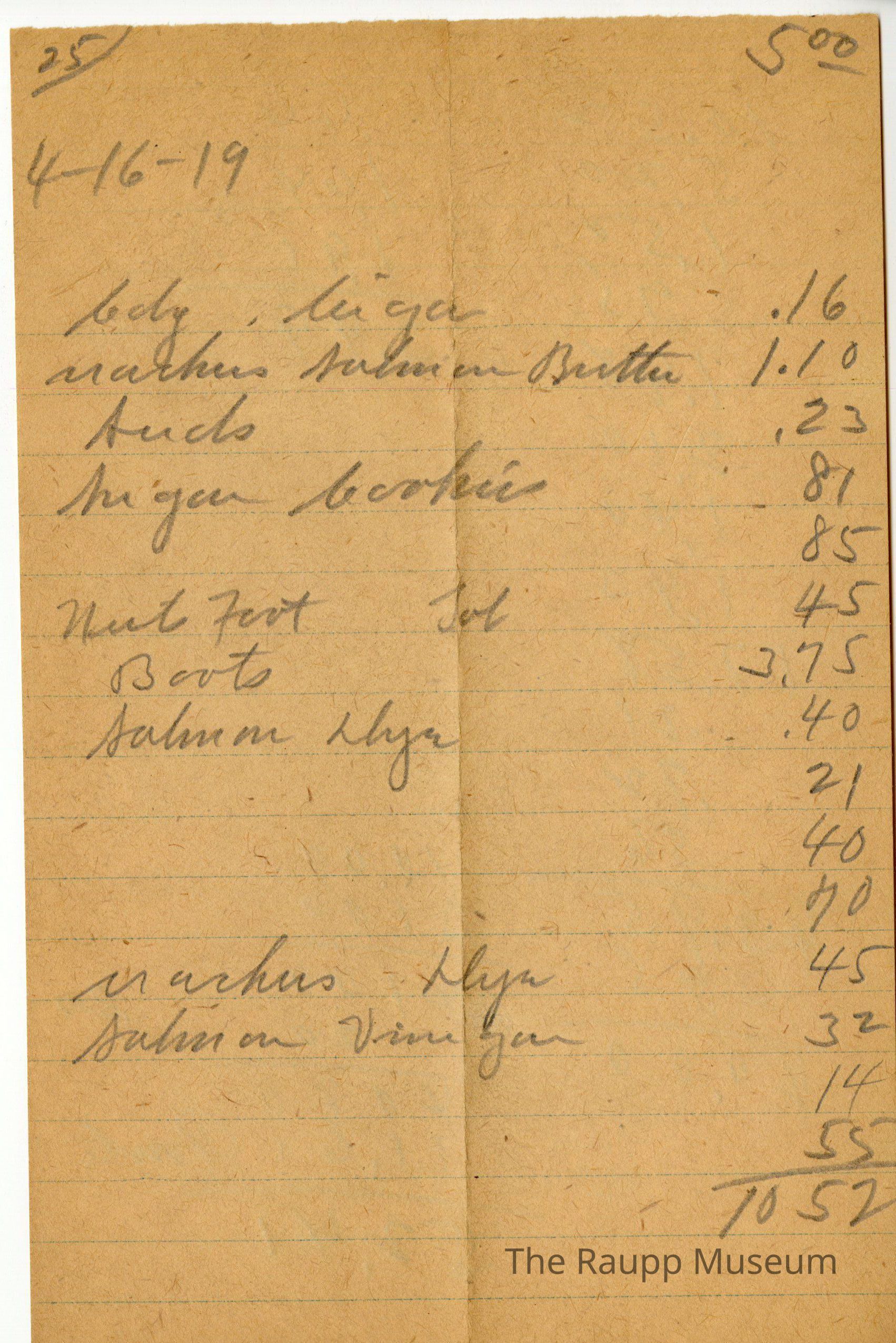 One (1) Firnbach and Raupp store receipt from April 16, 1919. Receipt is rectangular with handwritten notes in pencil. The receipt does not indicate who it is for. They bought candy and a cigar for $0.16, crackers, salmon, and butter for $1.10, seeds for $0.23, sugar and cookies for $0.81, (?) for $0.85, nuts, foot(?), and tab for $0.45, boots for $3.75, salmon and dye for $0.40, (?) for $0.21, (?) for $0.40, (?) for $0.70, crackers and dye for $0.45, salmon and vinegar for $0.32, (?) for $0.14, (?) for $0.55. Bill total was $10.52.Archive Details