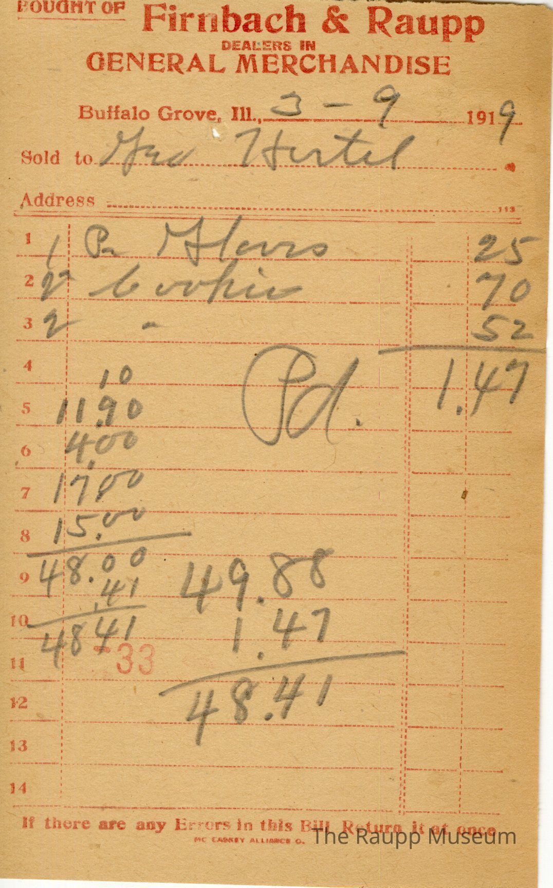The red text is as follows, from top to bottom: Bought of Firnbach & Raupp; Dealers in GENERAL MERCHANDISE; Buffalo Grove, Ill.,; Sold to; Address; If there are any Errors in this Bill Return it at once; Mc Caskey Alliance O.Archive Details