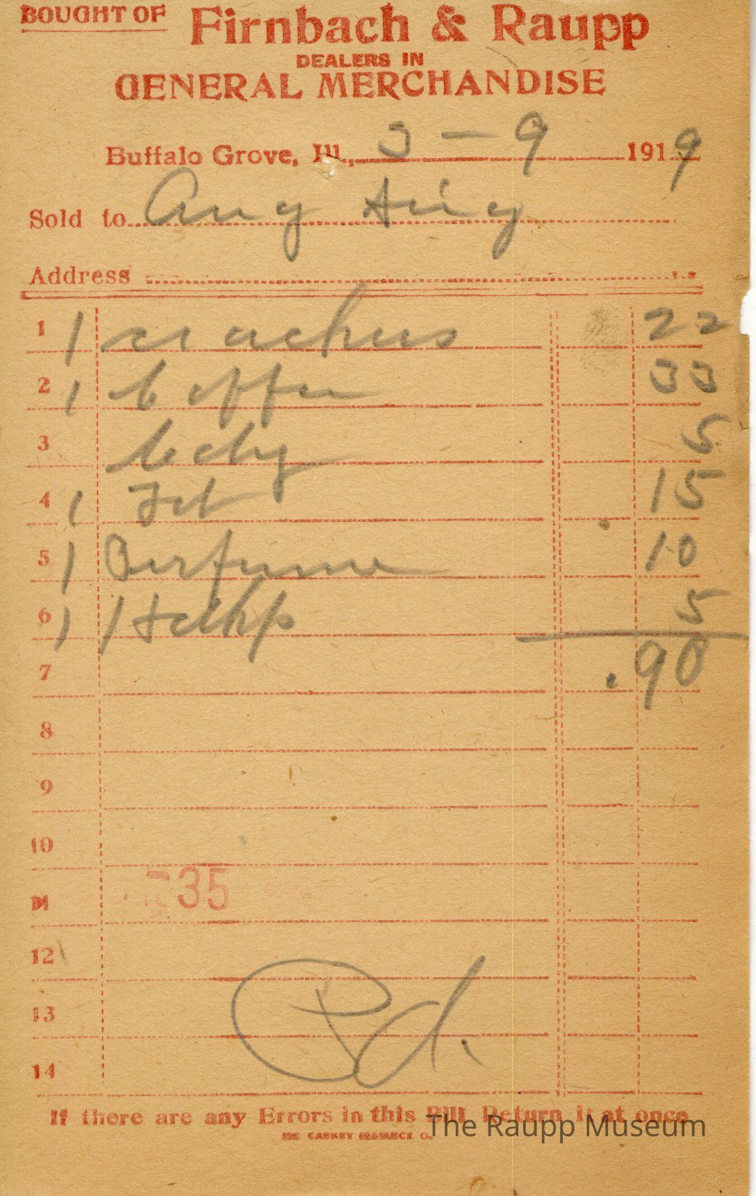 One (1) Firnbach and Raupp store receipt from March 9, 1919. Receipt is rectangular with red printed text and written notes in pencil. The receipt is for Aug Seig, who bought 1 crackers for $0.22, 1 coffee for $0.33, candy for $0.05, 1 tab for $0.15, 1 perfume for $0.10, and 1 hdhp(?) for $0.05. Bill total was $0.90. The bill is marked as paid. There is a red "35" near the bottom.