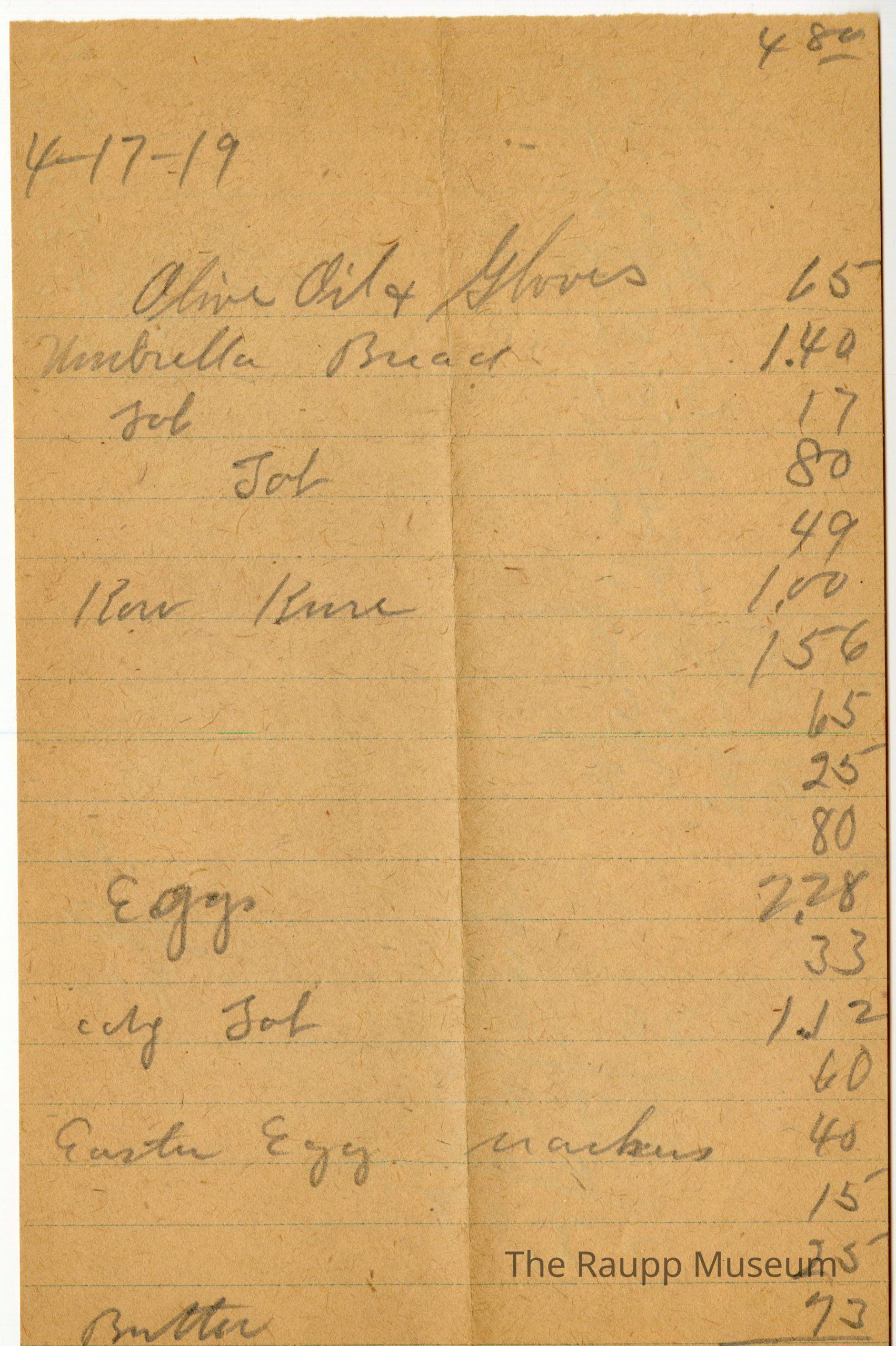 One (1) Firnbach and Raupp store receipt from April 17, 1919. Receipt is rectangular with handwritten notes in pencil. The receipt does not indicate who it is for. They bought Olive oil and gloves for $0.65, umbrella and bread for $1.40, tab for $0.17, tab for $0.80, (?) for $0.49, raw rure(?) for $1.00, (?) for $1.56, (?) for $0.65, (?) for $0.25, (?) for $0.80, Eggs for $2.28, (?) for $0.33, candy and tab for $1.12, (?) for $0.60, easter egg and crackers for $0.40, (?) for $0.15, (?) for $0.25, butter for $0.73. Bill total was $13.73.Archive Details