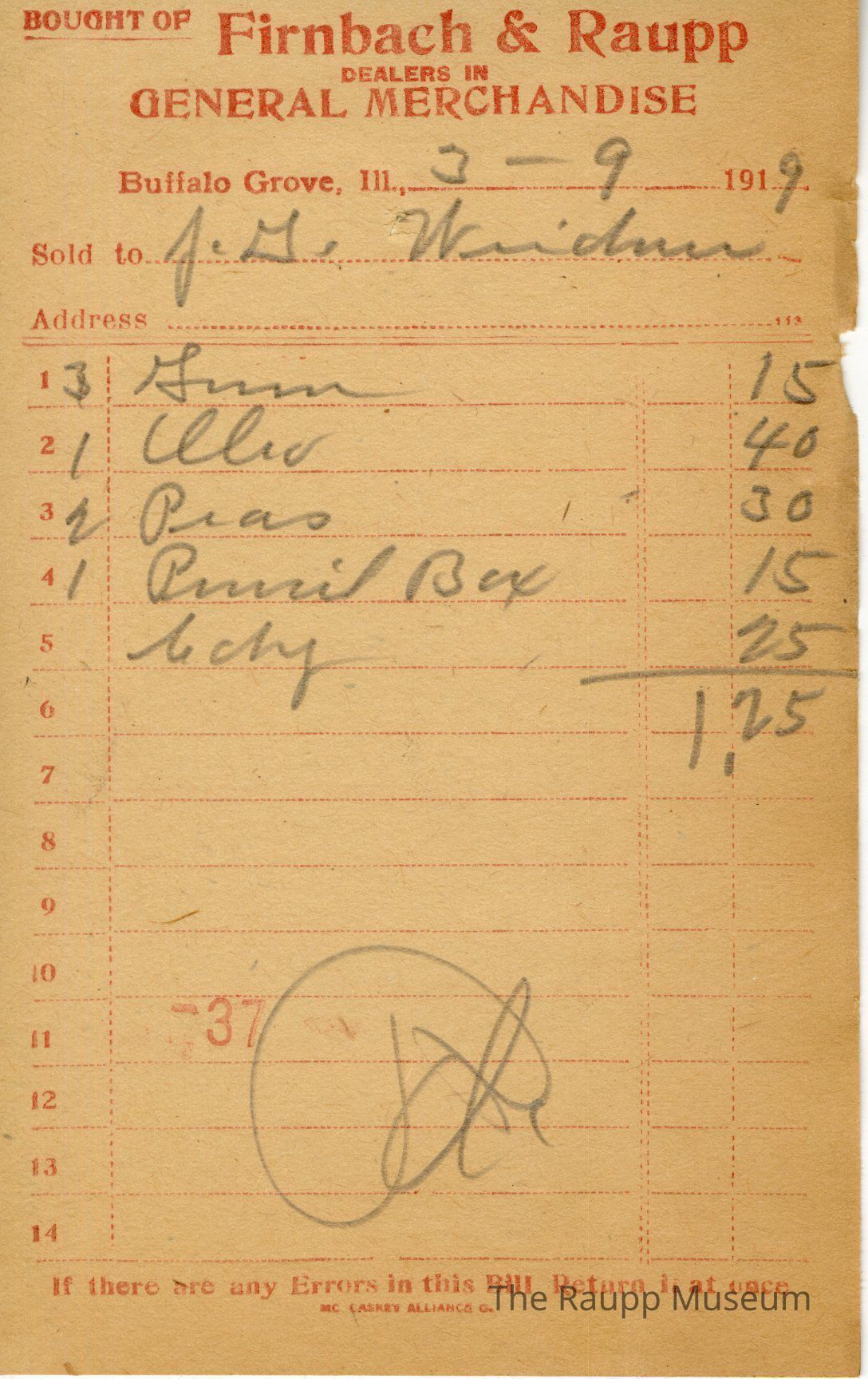 One (1) Firnbach and Raupp store receipt from March 9, 1919. Receipt is rectangular with red printed text and written notes in pencil. The receipt is for J. G. Weidner, who bought 1 gum for $0.15, 1 oleo for $0.40, 2 peas for $0.30, 1 pencil box for $0.15, and candy for $0.25. Bill total was $1.25. The bill is marked as paid. There is a red "37" near the bottom.