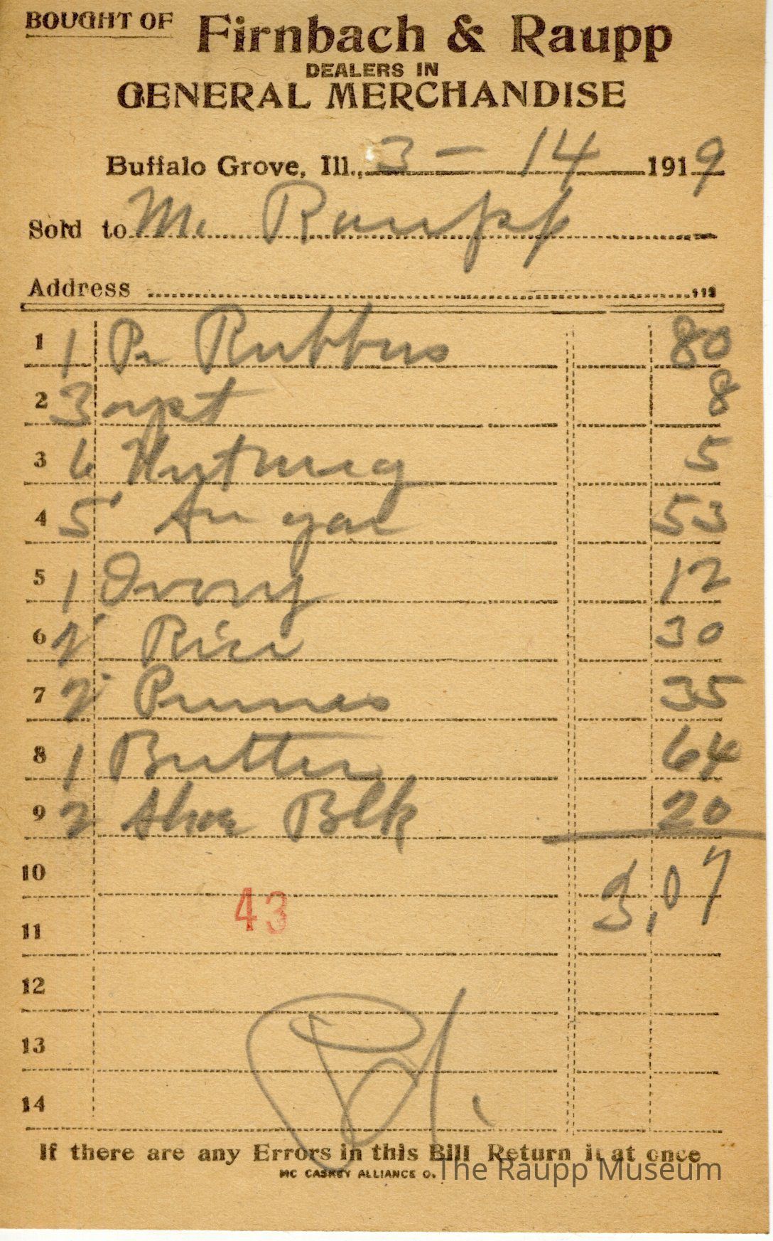 One (1) Firnbach and Raupp store receipt from March 14, 1919. Receipt is rectangular with black printed text and written notes in pencil. The receipt is for M. Raupp, who bought 1 pair for rubbers for $0.80, 3 yeast for $0.08, 6 nutmeg for $0.05, 5 pounds of sugar for $0.53, 1 ivory for $0.12, 2 pounds of rice for $0.30, 2 pounds of prunes(?) for $0.35, 1 butter for $0.64, and 2 shoe black for $0.20. Bill total was $3.07. The bill is marked as paid. There is a red "43" near the bottom.