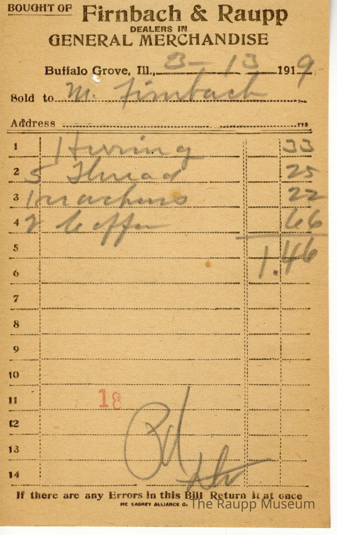 The black text is as follows, from top to bottom: Bought of Firnbach & Raupp; Dealers in GENERAL MERCHANDISE; Buffalo Grove, Ill.,; Sold to; Address; If there are any Errors in this Bill Return it at once; Mc Caskey Alliance O.Archive Details