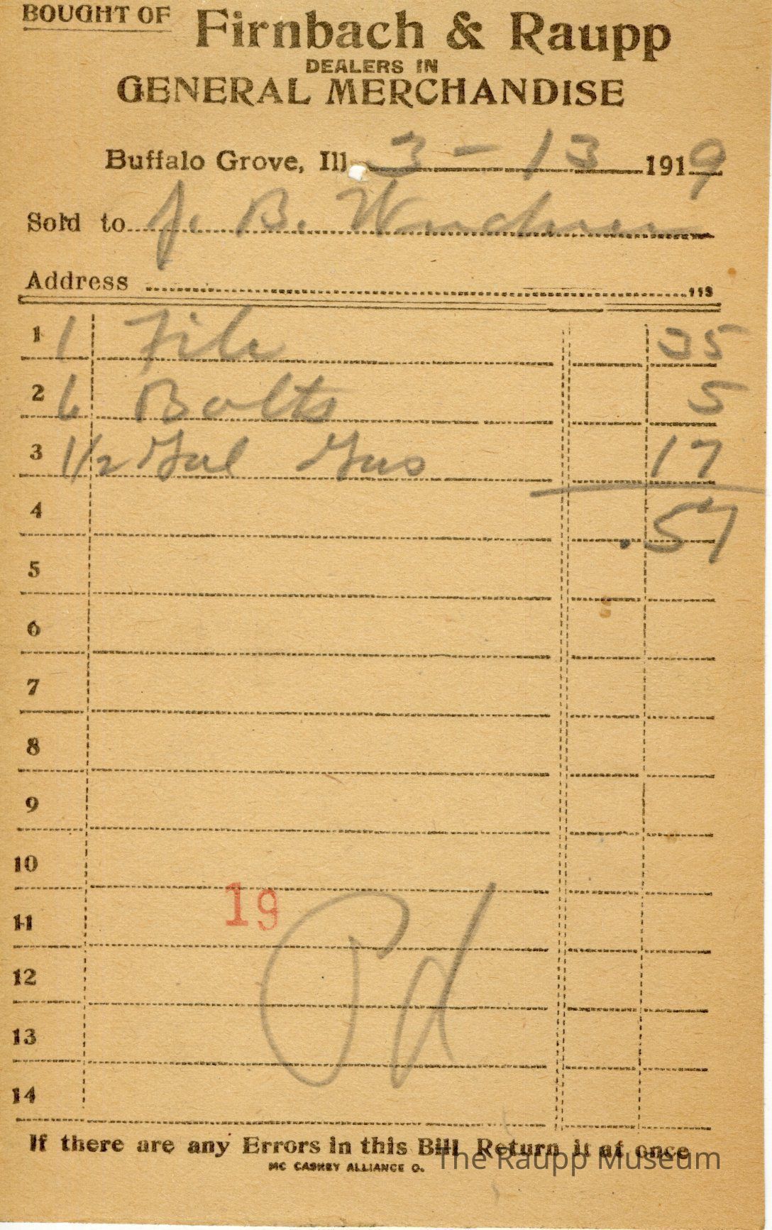 The black text is as follows, from top to bottom: Bought of Firnbach & Raupp; Dealers in GENERAL MERCHANDISE; Buffalo Grove, Ill.,; Sold to; Address; If there are any Errors in this Bill Return it at once; Mc Caskey Alliance O.Archive Details