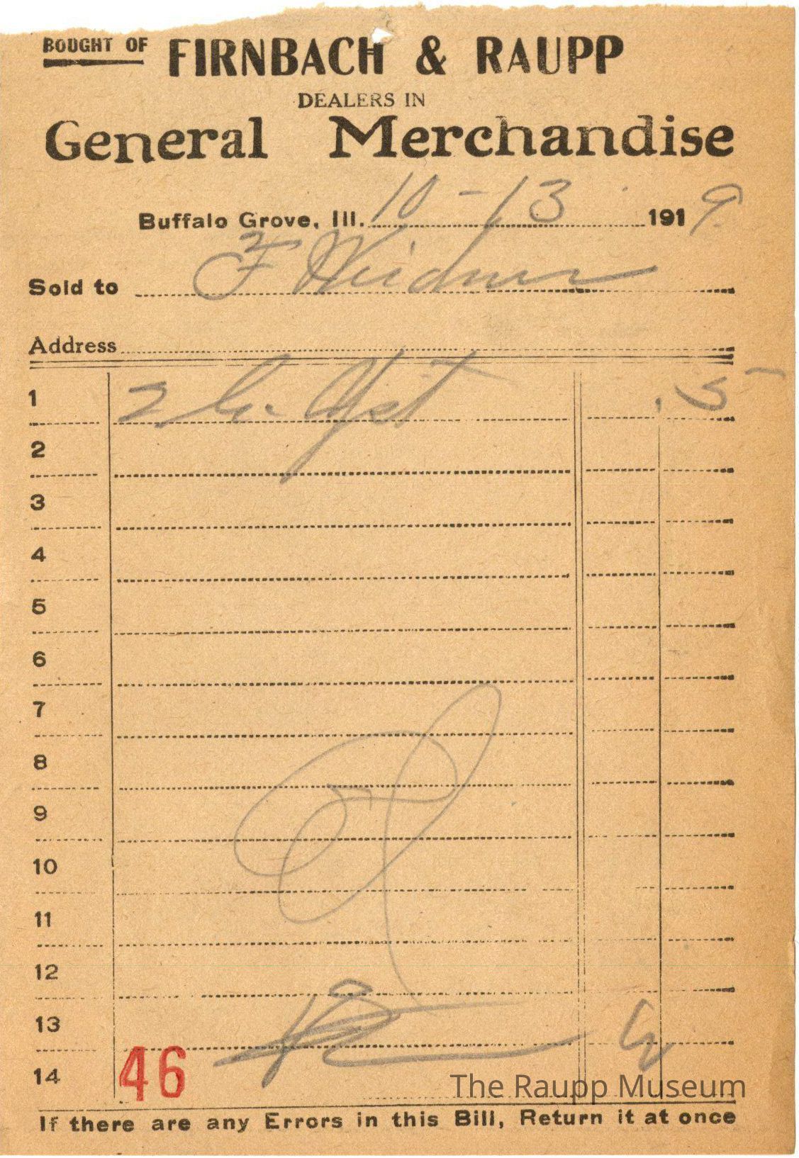 The black text is as follows, from top to bottom: Bought of Firnbach & Raupp; Dealers in GENERAL MECHANDISE; Buffalo Grove, Ill.; Sold to; Address; if there are any Errors in this Bill, Return it at once.Archive Details