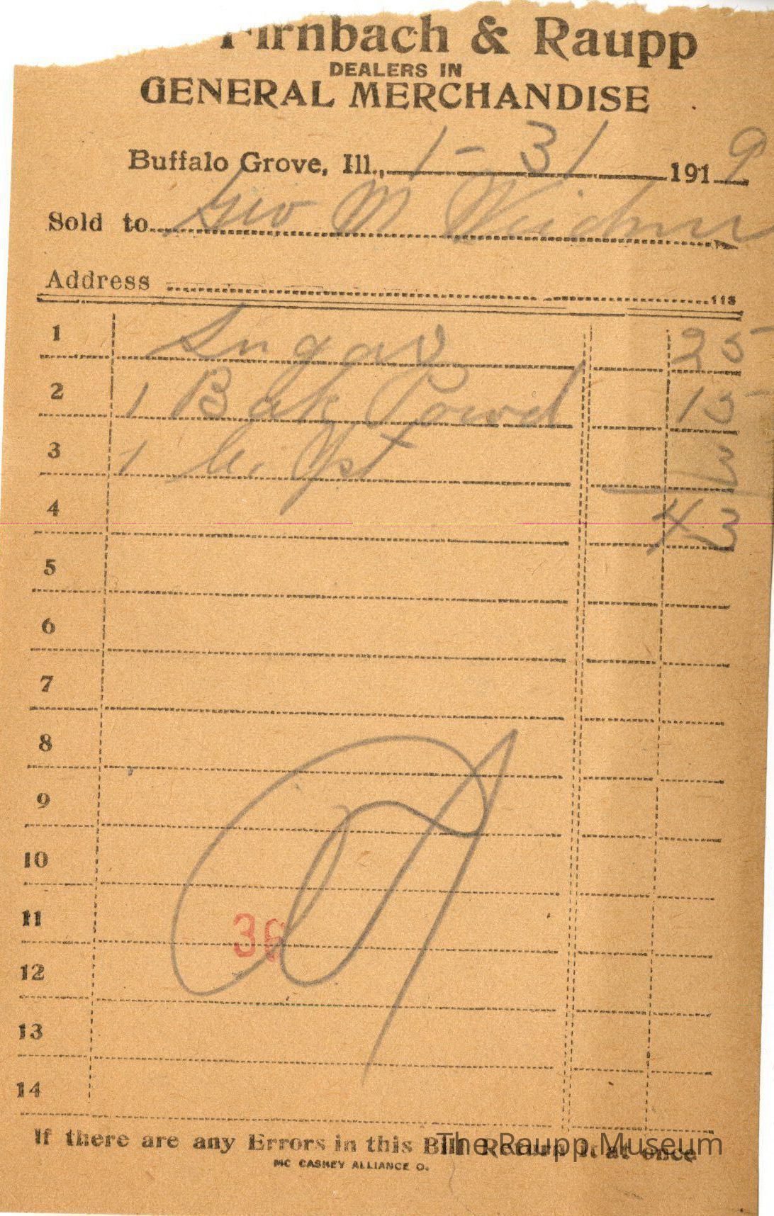 The black text is as follows, from top to bottom: "Bought of Firnbach and Raupp; Dealers in GENARL MERCHANDISE; Buffalo Grove, Ill; Sold to; Address; if there are any Errors in this Bill Return it at once; MC CASKEY ALLIANCE O;Archive Details