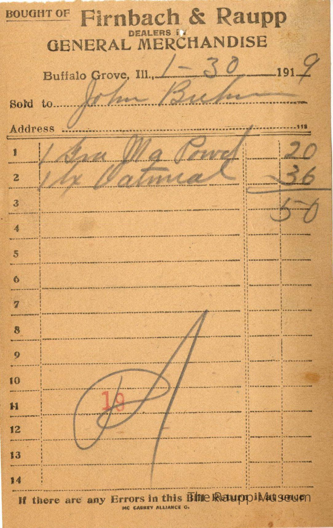 One (1) Firnbach and Raupp store receipt from January 30th, 1919. Receipt is rectangular with black printed text and handwritten notes in pencil. Receipt is for John Brehm who bought 1 Gru Ma powder(?) for $0.20, 1 pack of oatmeal for $0.36. The bill total was $0.50. They paid $0.50 by cash. The bill was marked as paid. There is a red stamp of "19".
