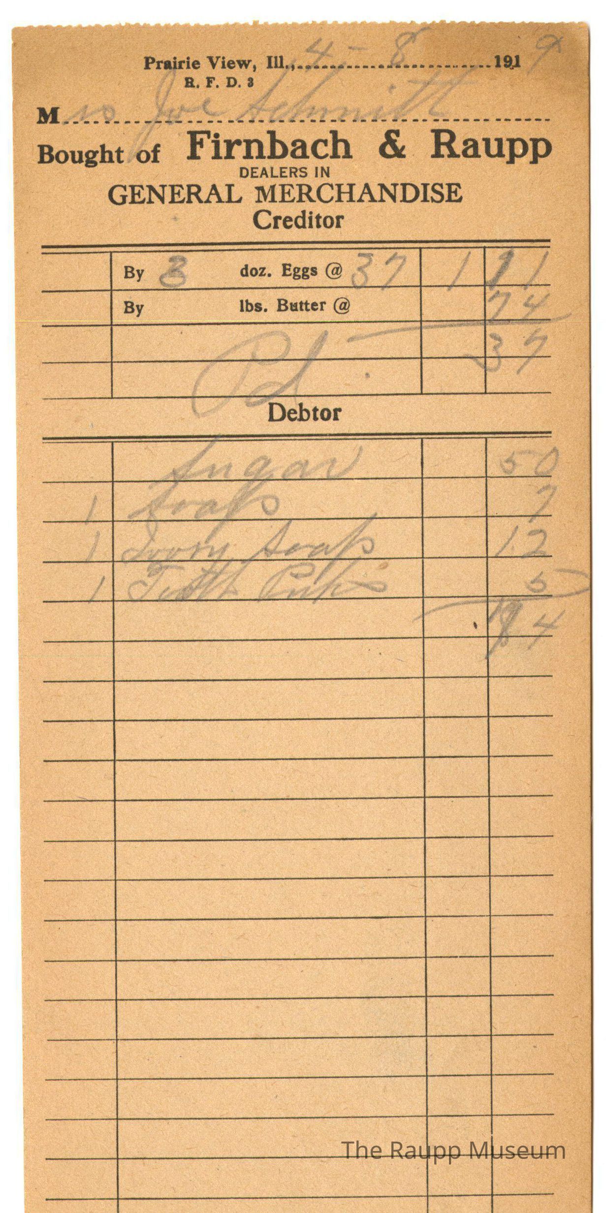 One (1) Firnbach and Raupp store receipt from April 8, 1919. Receipt is rectangular with black printed text and handwritten notes in pencil. The receipt is for Mrs. Joe Schmitt, who sold 3 doz. eggs @ $0.37 per dozen, and bought sugar for $0.50, 1 soap for $0.07, 1 ivory soap for $0.12, 1 tooth picks for $0.05. Bill Total was $0.74 but the store owed $1.91 for the eggs so they paid her $0.37. The bill is marked as paid.