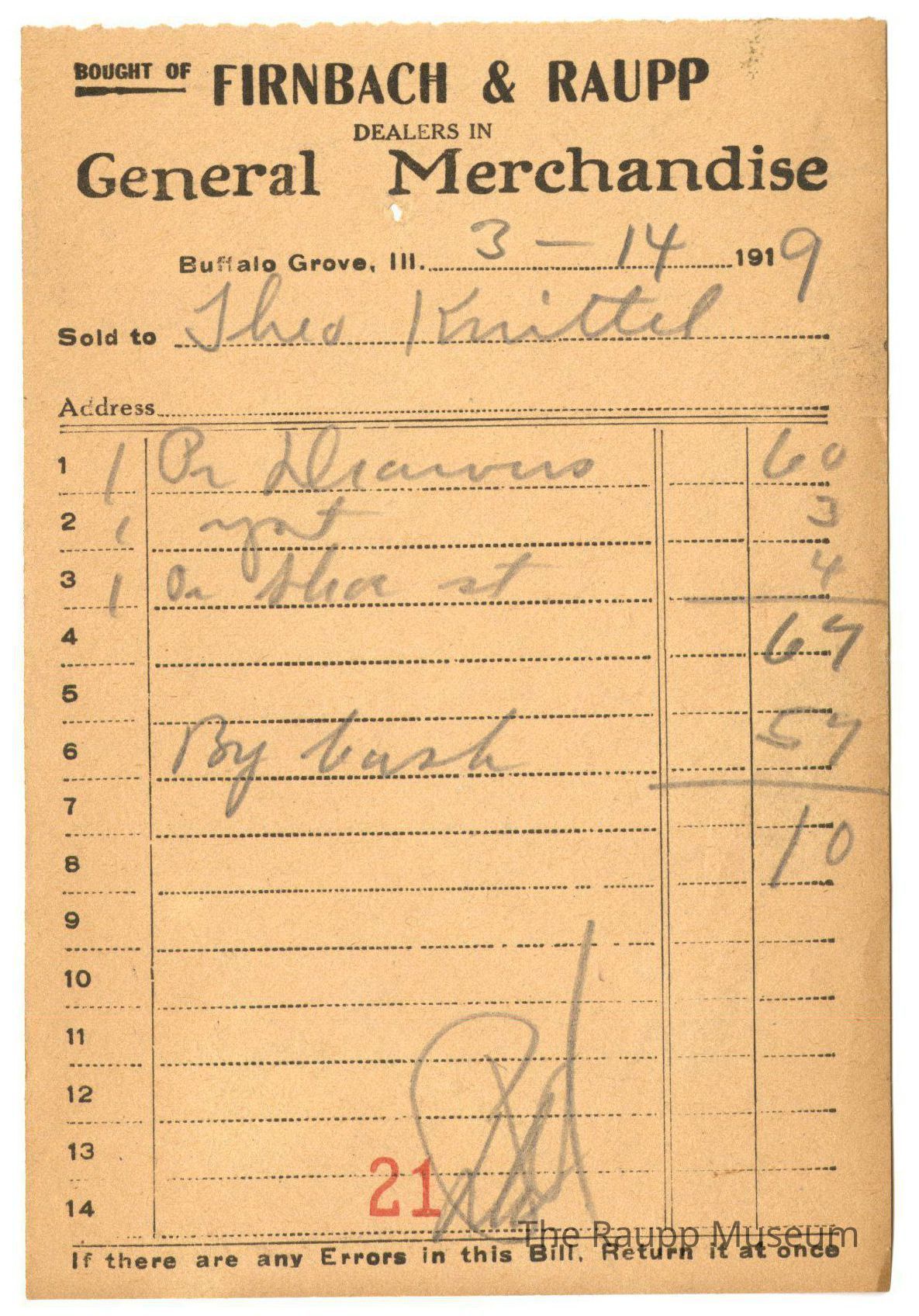 The black text is as follows, from top to bottom: "Bought of FIRNBACH & RAUPP: Dealers in General Merchandise; Buffalo Grove , Ill.; Sold to; Address; If there are any Errors in this Bill, Return it at once."Archive Details