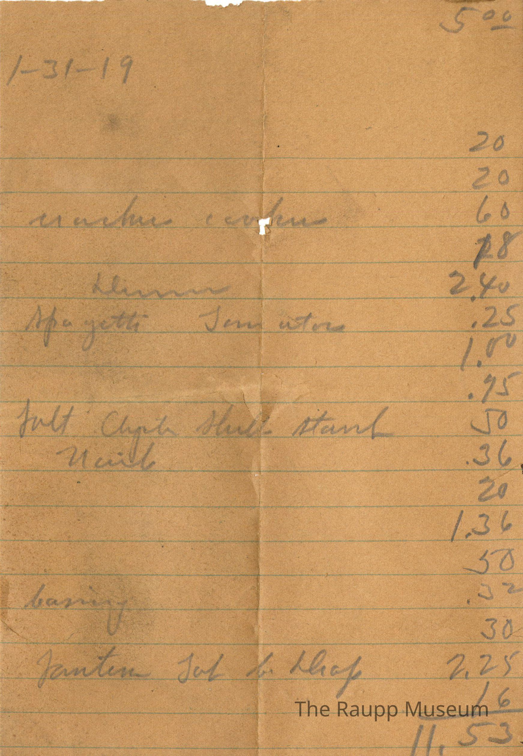 One (1) receipt from January 30th, 1919. Receipt is rectangular sheet of lined paper with handwritten notes in pencil. The following things are listed: cookies, spaghetti, jam, water(?), Salt chips(?), lantern, and some scribbles.The bill total was $11.53. They paid $11.53 by cash.