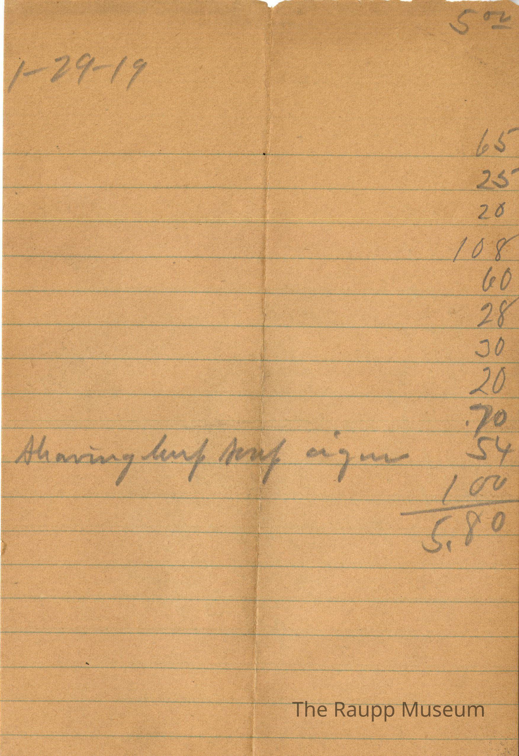 One (1) receipt from January 29th, 1919. Receipt is rectangular sheet of lined paper with handwritten notes in pencil. The following things are listed: Shaving lump soap(?)The bill total was $5.80. They paid $5.80 by cash.