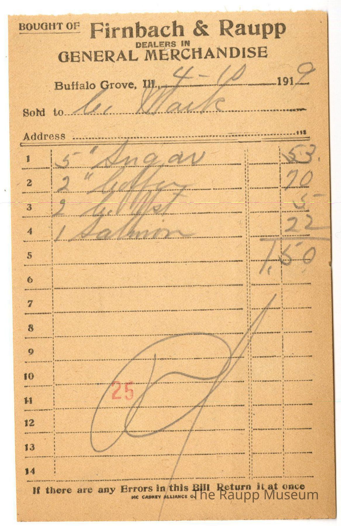 One (1) Firnbach and Raupp store receipt from April 10, 1919. Receipt is rectangular with black printed text and handwritten notes in pencil. The receipt is for C. Mark(?) who bought 5 pounds sugar for $0.53, 2 pounds coffee for $0.70, 2 c. yeast for $0.05, 1 salmon for $0.22. Bill total was $1.50 and is marked as paid. There is a red stamp of 25 close to the bottom.