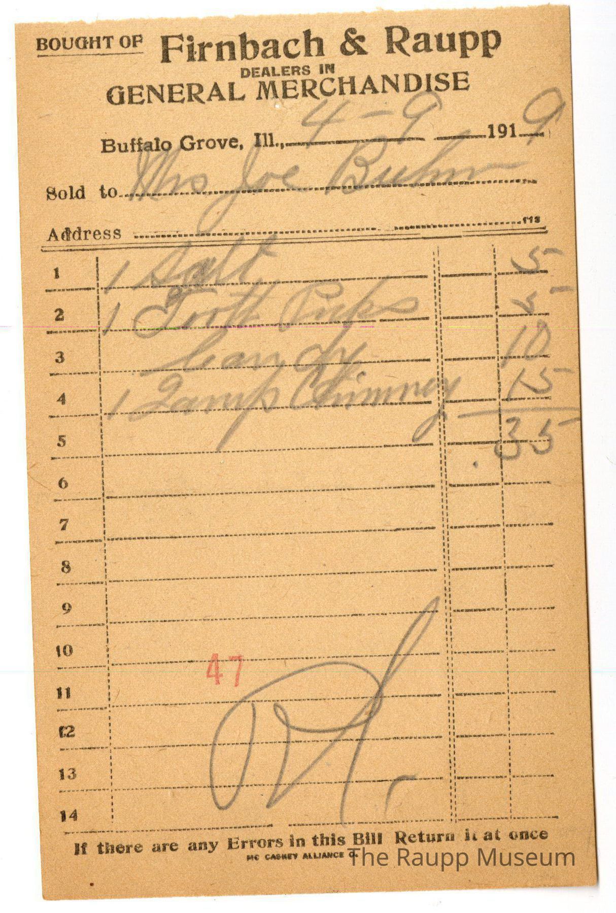 The black text is as follows, from top to bottom: "Bought of Firnbach and Raupp: Dealers in GENERAL MERCHANDISE; Buffalo Grove , Ill.; Sold to; Address; If there are any Errors in this Bill Return it at once; MC CARNEY ALLIANCE O."Archive Details