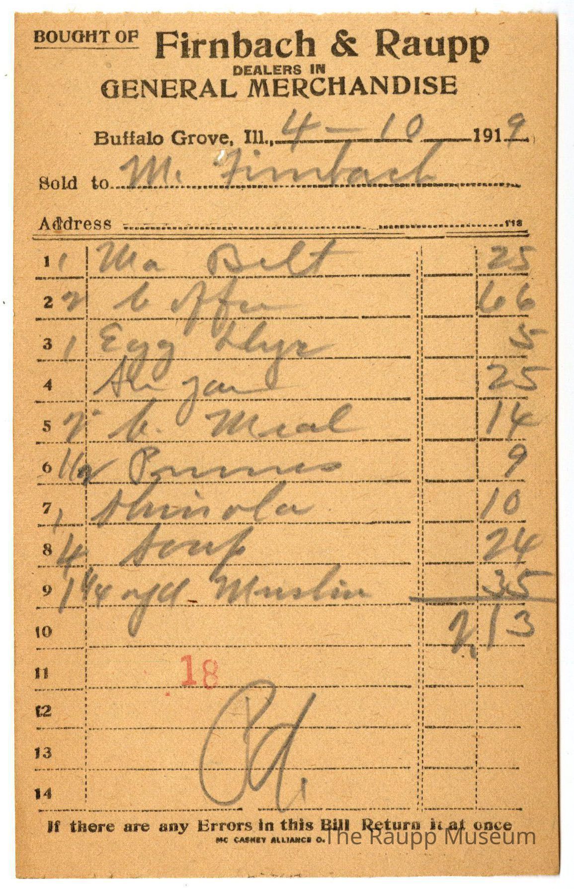 The black text is as follows, from top to bottom: "Bought of Firnbach and Raupp: Dealers in GENERAL MERCHANDISE; Buffalo Grove , Ill.; Sold to; Address; If there are any Errors in this Bill Return it at once; MC CARNEY ALLIANCE O."Archive Details