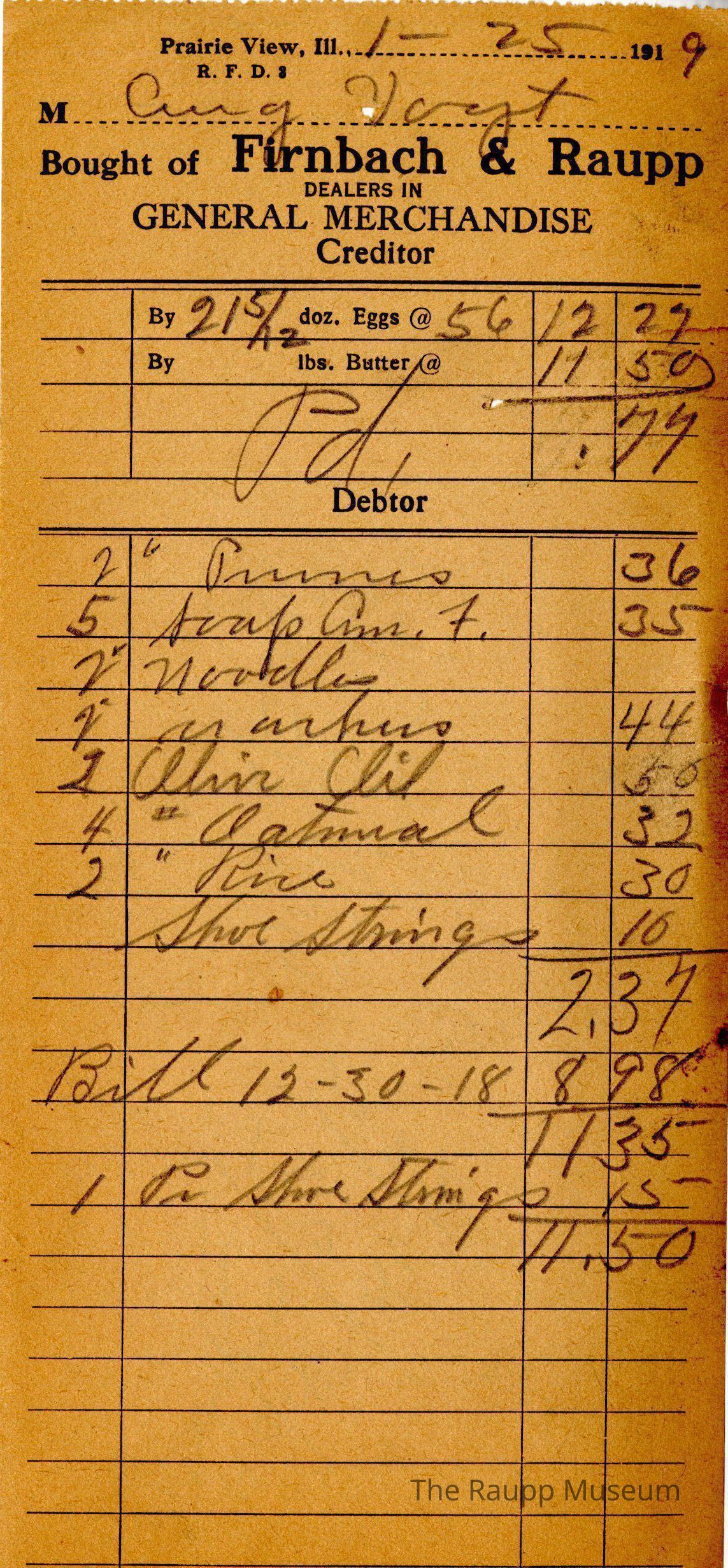 One (1) Firnbach and Raupp store receipt from January 25th 1919. The receipt is for August Vogt who sold 2 and 5/12 dozens of eggs at $0.56 each , and butter for $11.50. Total accounting to $0.77. He bought 2 pounds of prunes for $0.36, 5 bars of soap Gm 7(?) for $0.35, 2 needles(?) for a not mentioned cost, marches(?) for $0.44, 2 bottles of olive oil for $0.50, 4 pounds of oatmeal for $0.32, 2 pounds of rice for $0.30, 1 shoe string for $0.10. The total of this purchase was $2.37 with an additional due bill of $8.98 and 1 pair of shoe string for $0.15. The bill total was $11.50. They paid $11.50 by cash. The bill was marked as paid.