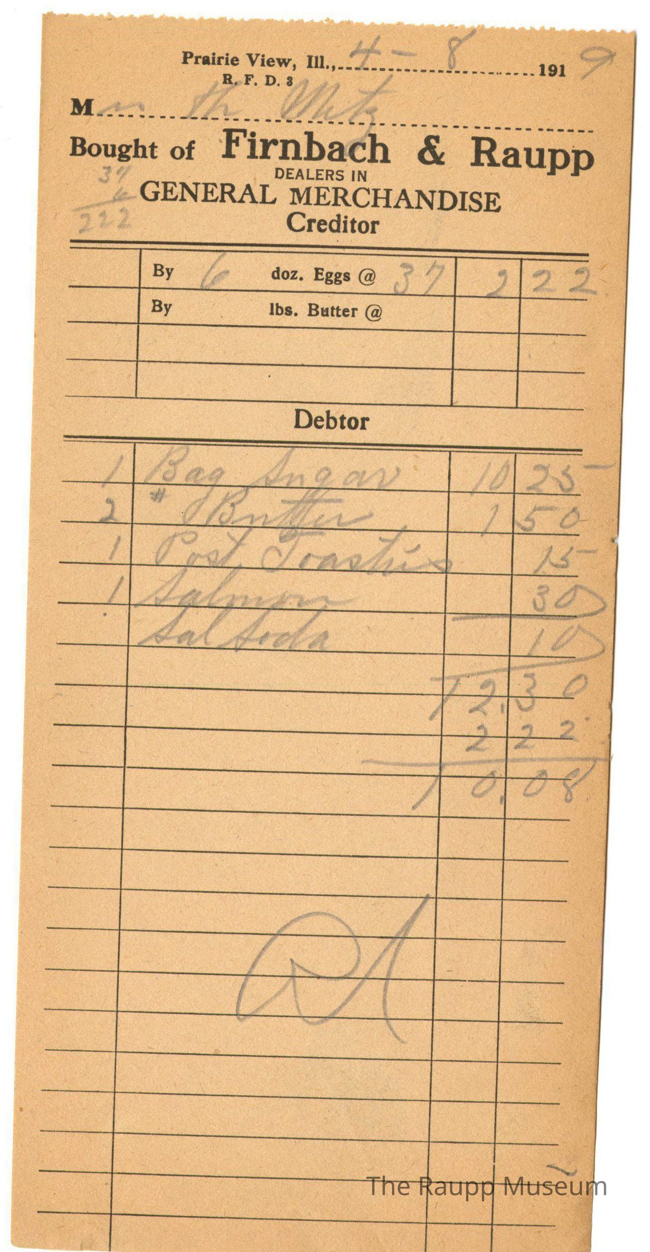The black text is as follows, from top to bottom: Prairie View, Ill. ; Bought of Firnbach and Raupp: Dealers in GENERAL MERCHANDISE; Creditor; By, doz. Eggs @; By, lbs. Butter @; Debtor"Archive Details