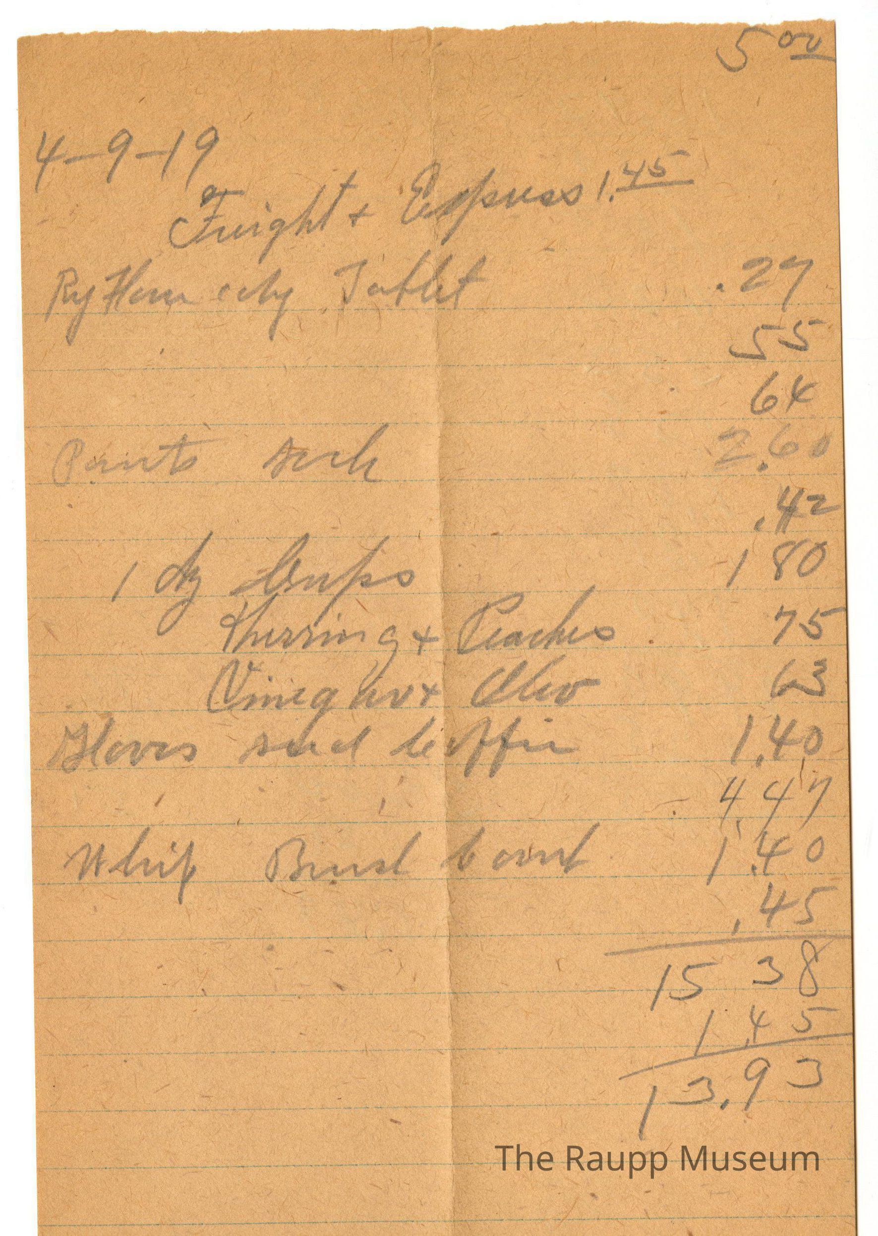 One (1) Firnbach and Raupp store receipt from April 9, 1919. Receipt is rectangular with handwritten notes in pencil. The receipt does not indicate who it is for. They bought Freight and Express for $1.45, ry, flour, candy, and tablet for $0.27, (?) for $0.55, (?) for $0.64, pants and sock for $2.60, (?) for $0.42, 1 dozen cups(?) for $1.80, herring and peaches for $0.75, vinegar and oleo for $0.63, gloves, seed, and coffee for $1.40, (?) for $4.47, whip, brush, and comb for $1.40, (?) for $0.45 . Bill total was $15.38 but the cost of freight and express was subtracted making the new total $13.93.Archive Details