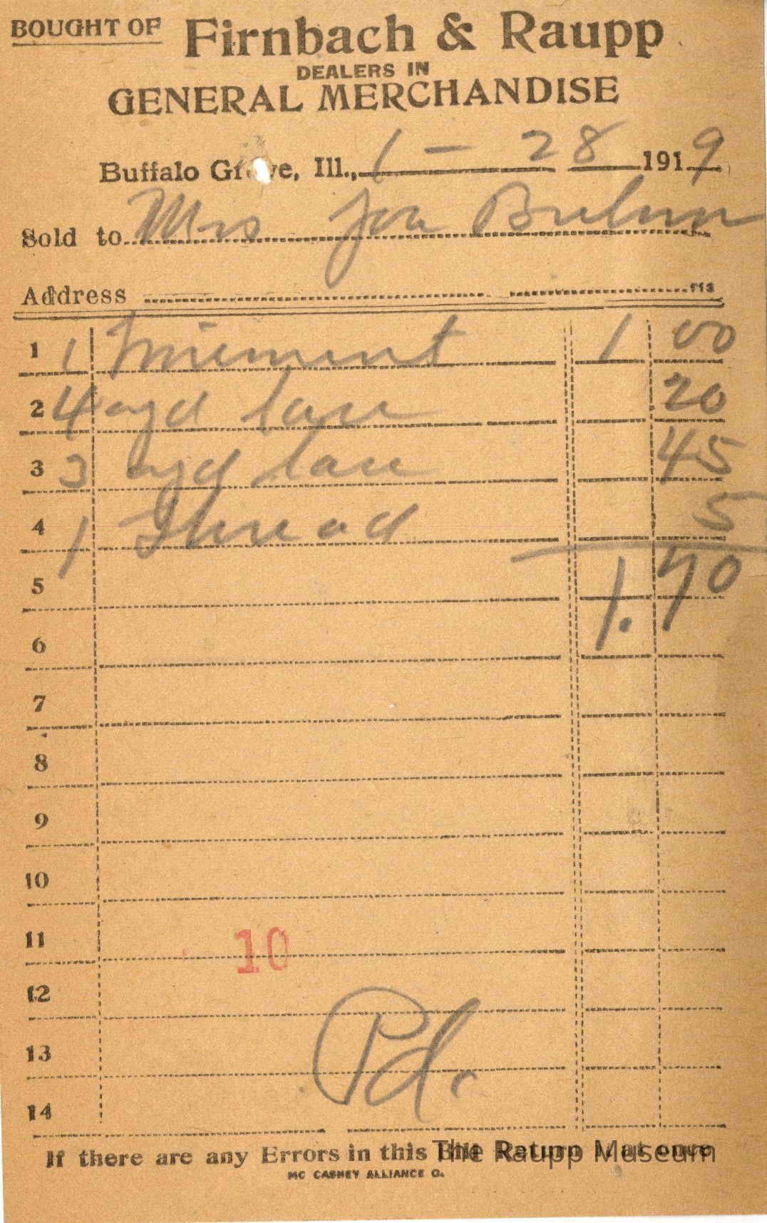 One (1) Firnbach and Raupp store receipt from January 28th, 1919. Receipt is rectangular with black printed text and handwritten notes in pencil. The receipt is for Mrs. Jua Brehm(?) who bought 1 pound of limminent(?) for $1.00, 4 yards of lace for $0.20, 3 yards of lace for $0.45, 1 thread for $0.05. Bill total was $1.70, and was paid by cash. The bill is marked as paid. There is a red stamp of "10" close to the bottom.
