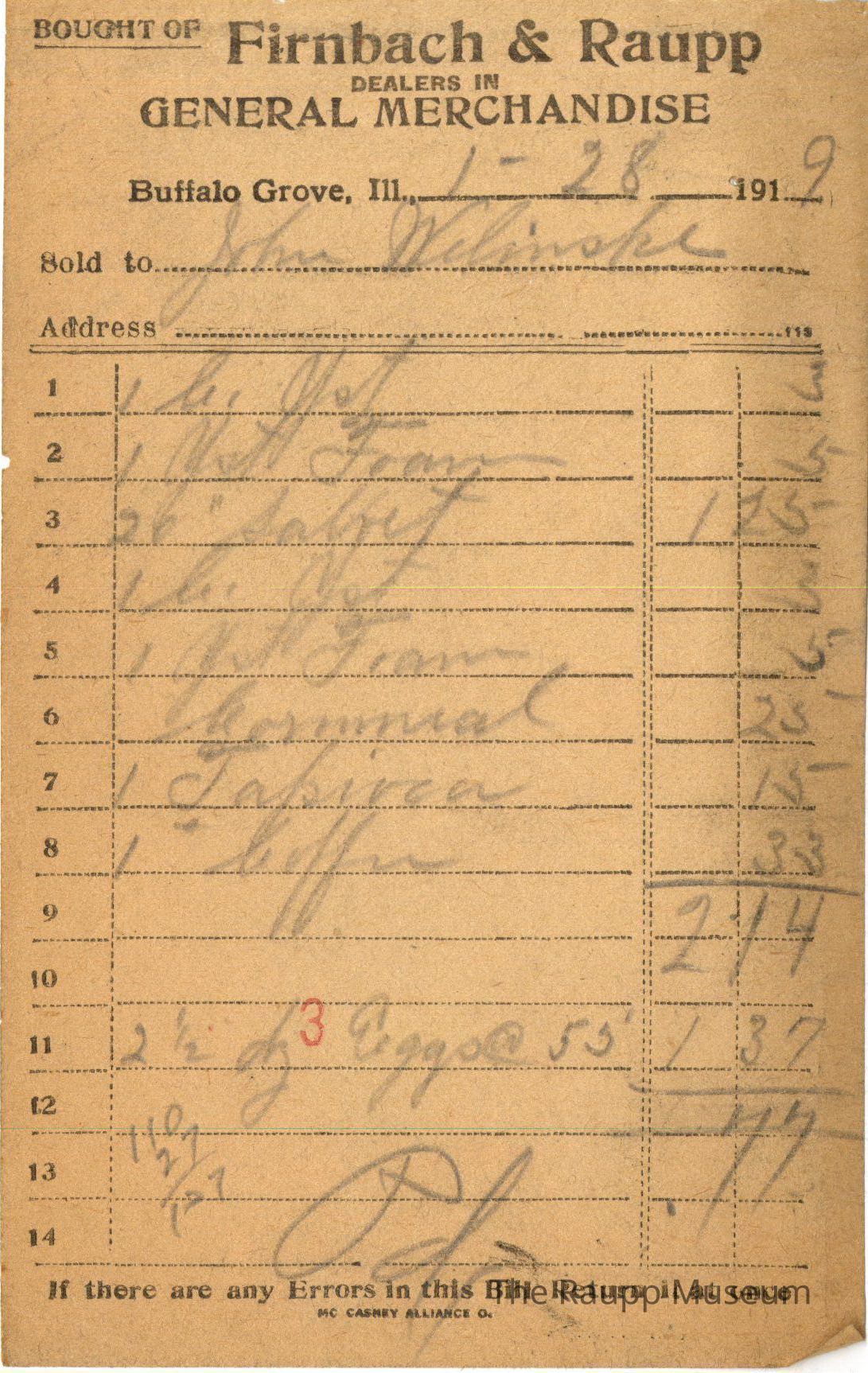 The black text is as follows, from top to bottom: "Bought of FIRNBACH & RAUPP: Dealers in General Merchandise; Buffalo Grove , Ill.; Sold to; Address; If there are any Errors in this Bill, Return it at once; MC CASKEY ALLIANCE O;."Archive Details
