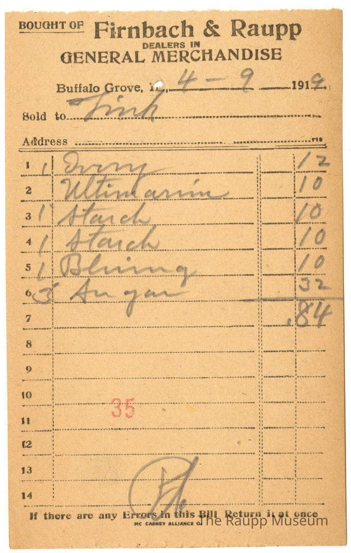 One (1) Firnbach and Raupp store receipt from April 9, 1919. Receipt is rectangular with black printed text and handwritten notes in pencil. The receipt is for Link who bought 1 ivory for $0.12, ultimarnine(?) for $0.10, 1 starch for $0.10, 1 starch for $0.10, 1 bluing for $0.10, 3 sugar for $0.32. Bill total was $0.84 and is marked as paid. There is a red stamp of 35 close to the bottom.