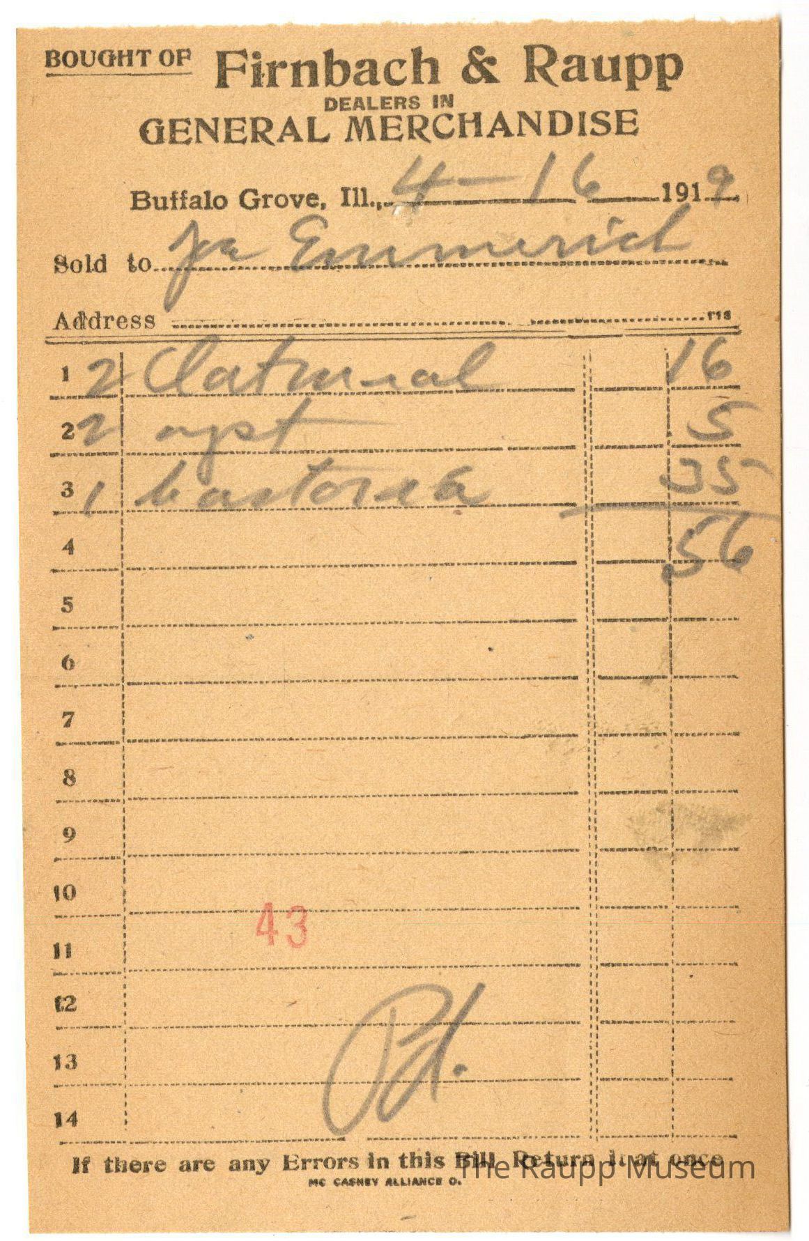 One (1) Firnbach and Raupp store receipt from April 16, 1919. Receipt is rectangular with black printed text and handwritten notes in pencil. The receipt is for Joe Emmerich who bought 2 oatmeal for $0.16, 2 yeast for $0.05, 1 castor...(?) for $0.35. Bill total was $0.56 and is marked as paid. There is a red stamp of 43 close to the bottom.