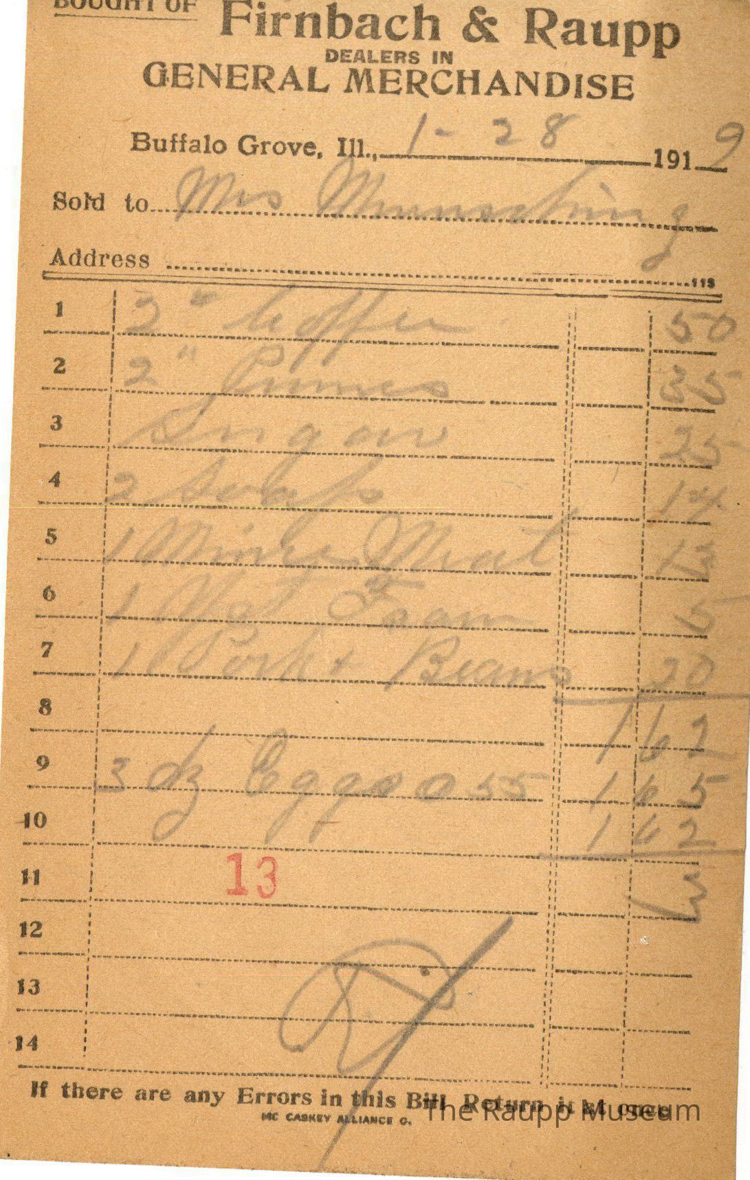 The black text is as follows, from top to bottom: Bought of Firnbach & Raupp; Dealers in GENERAL MECHANDISE; Buffalo Grove, Ill.; Sold to; Address; if there are any Errors in this Bill Return it at once.; MC CASKEY ALLIANCE O.Archive Details