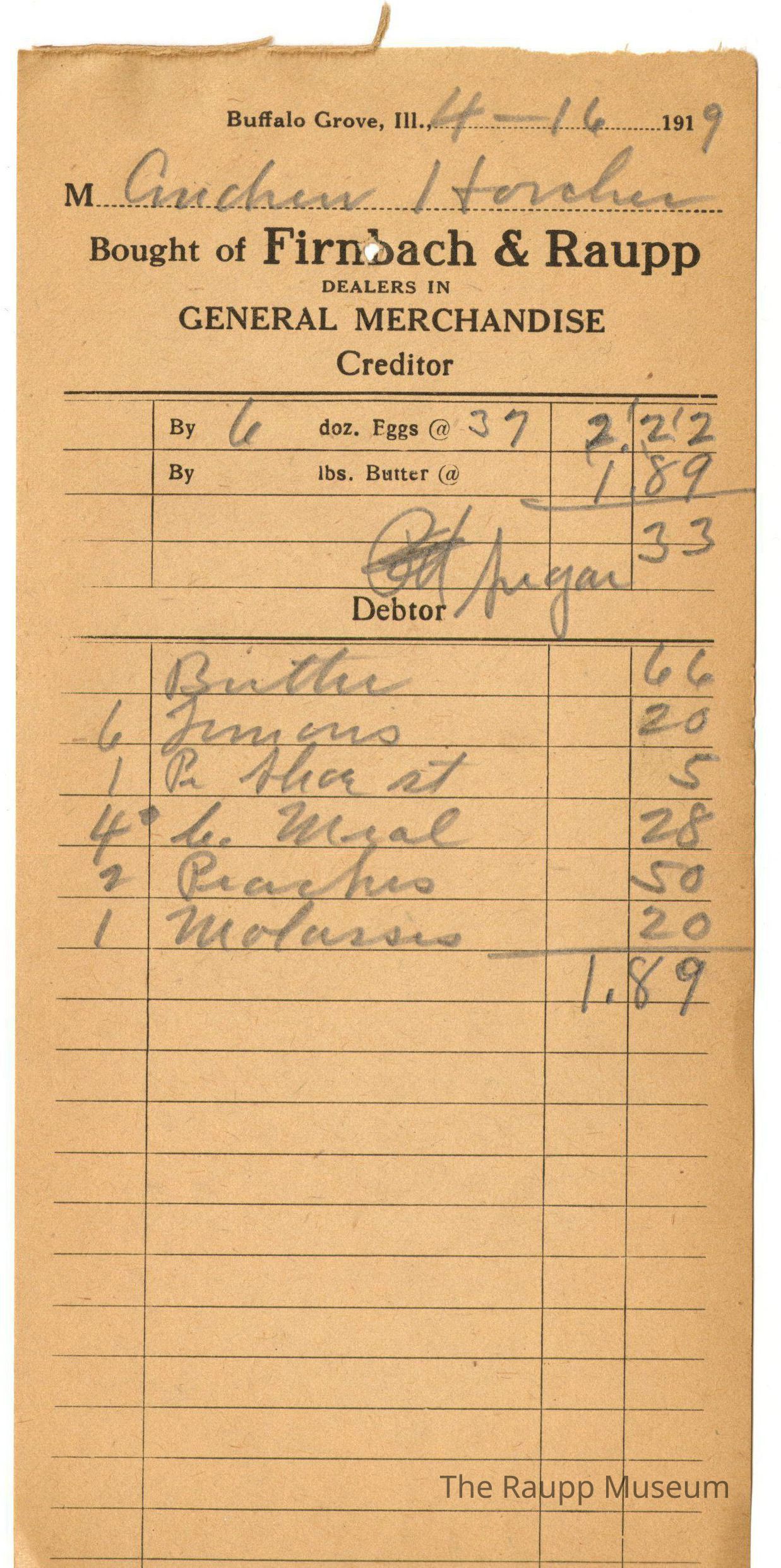 The black text is as follows, from top to bottom: Buffalo Grove, Ill. ; Bought of Firnbach and Raupp: Dealers in GENERAL MERCHANDISE; Creditor; By, doz. Eggs @; By, lbs. Butter @; Debtor"Archive Details