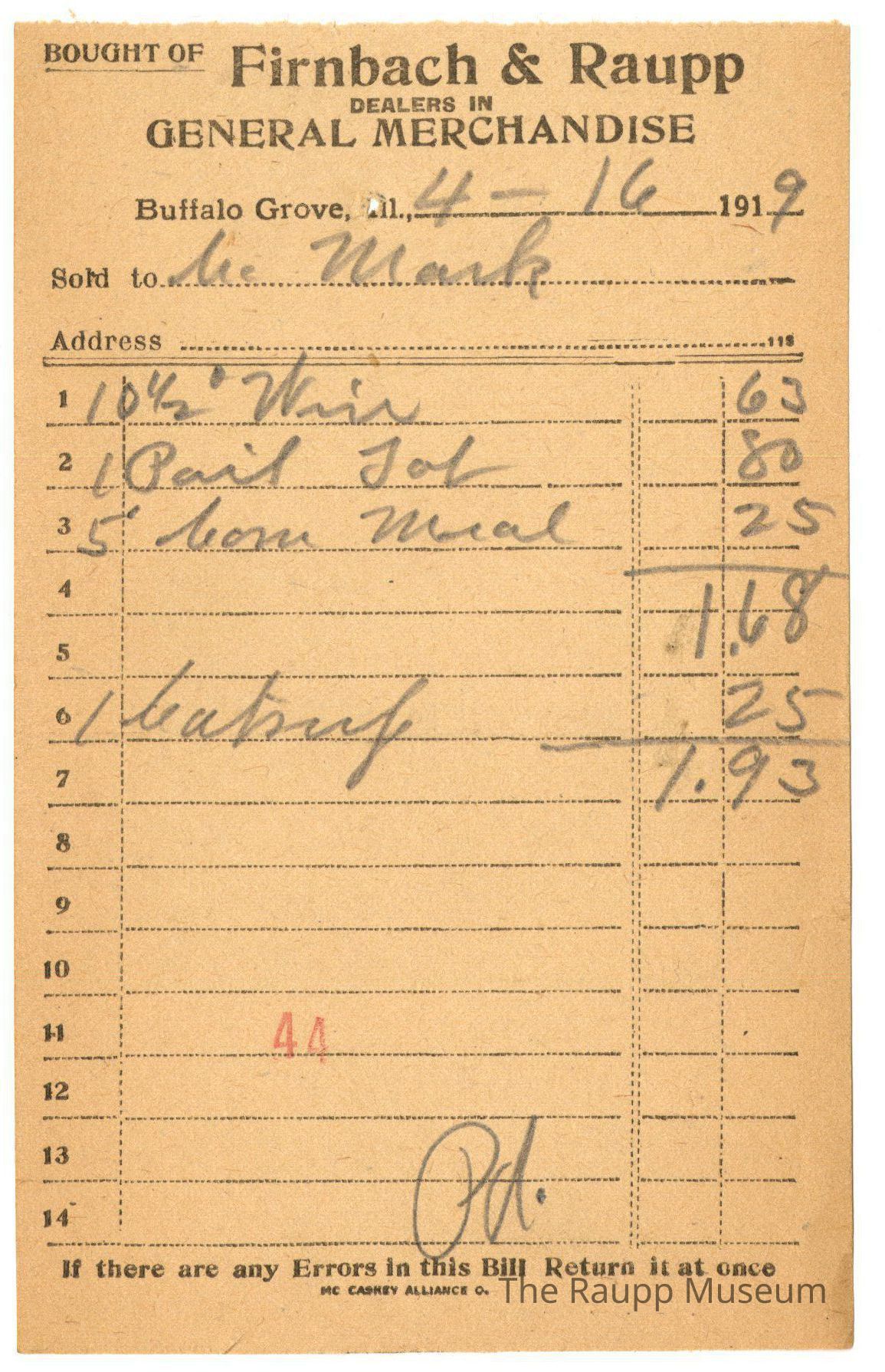 The black text is as follows, from top to bottom: "Bought of Firnbach and Raupp: Dealers in GENERAL MERCHANDISE; Buffalo Grove , Ill.; Sold to; Address; If there are any Errors in this Bill Return it at once; MC CARNEY ALLIANCE O."Archive Details