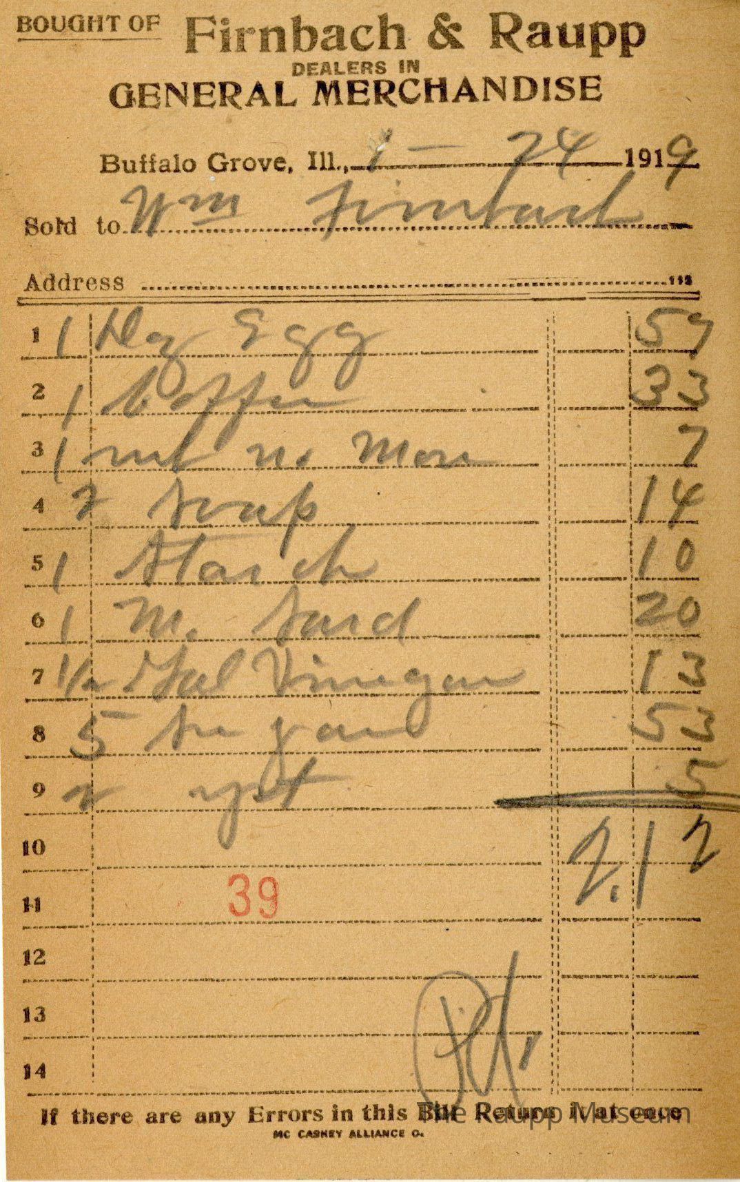 Receipt recipient is for Will Firnbach who bought 1 dozen of eggs for $0.57, 1 pound of coffee powder for $0.33, 1 Rub no more for $0.07, 2 bars of soap for $0.14, 1 pound of starch for $0.10, 1 M Sand(?) for $0.20, 1/2 gal of Mal Vinegar for $0.13, 5 pounds of sugar or $0.53, and yeast for $0.05. The bill total was $2.12, and was paid by cash. There is a red stamp of 39 at the bottom, and the bill is marked as paid.