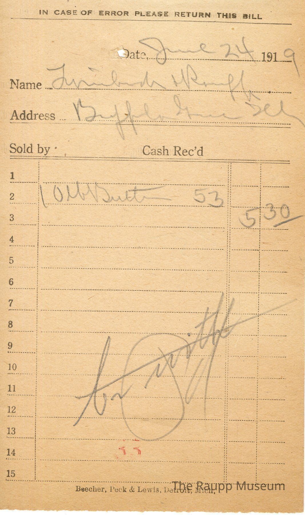 The black text is as follows, from top to bottom In Case of Error Please Return This Bill; Beecher, Peck & Lewis, Detroit, Mich. "Firnbach and Raupp" is written in pencil on the Name line. "Buffalo Grove" is written in pencil on the address line.Archive Details