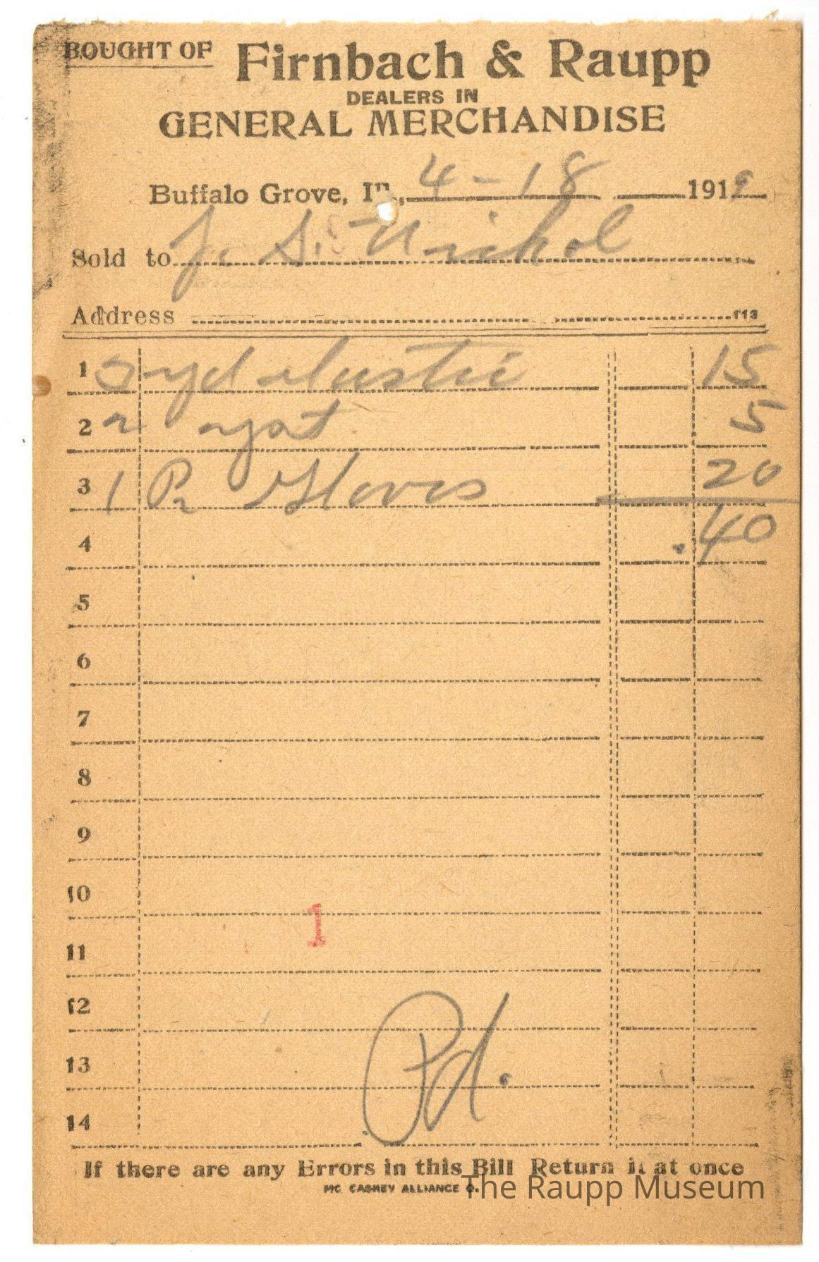 The black text is as follows, from top to bottom: "Bought of Firnbach and Raupp: Dealers in GENERAL MERCHANDISE; Buffalo Grove , Ill.; Sold to; Address; If there are any Errors in this Bill Return it at once; MC CARNEY ALLIANCE O."Archive Details