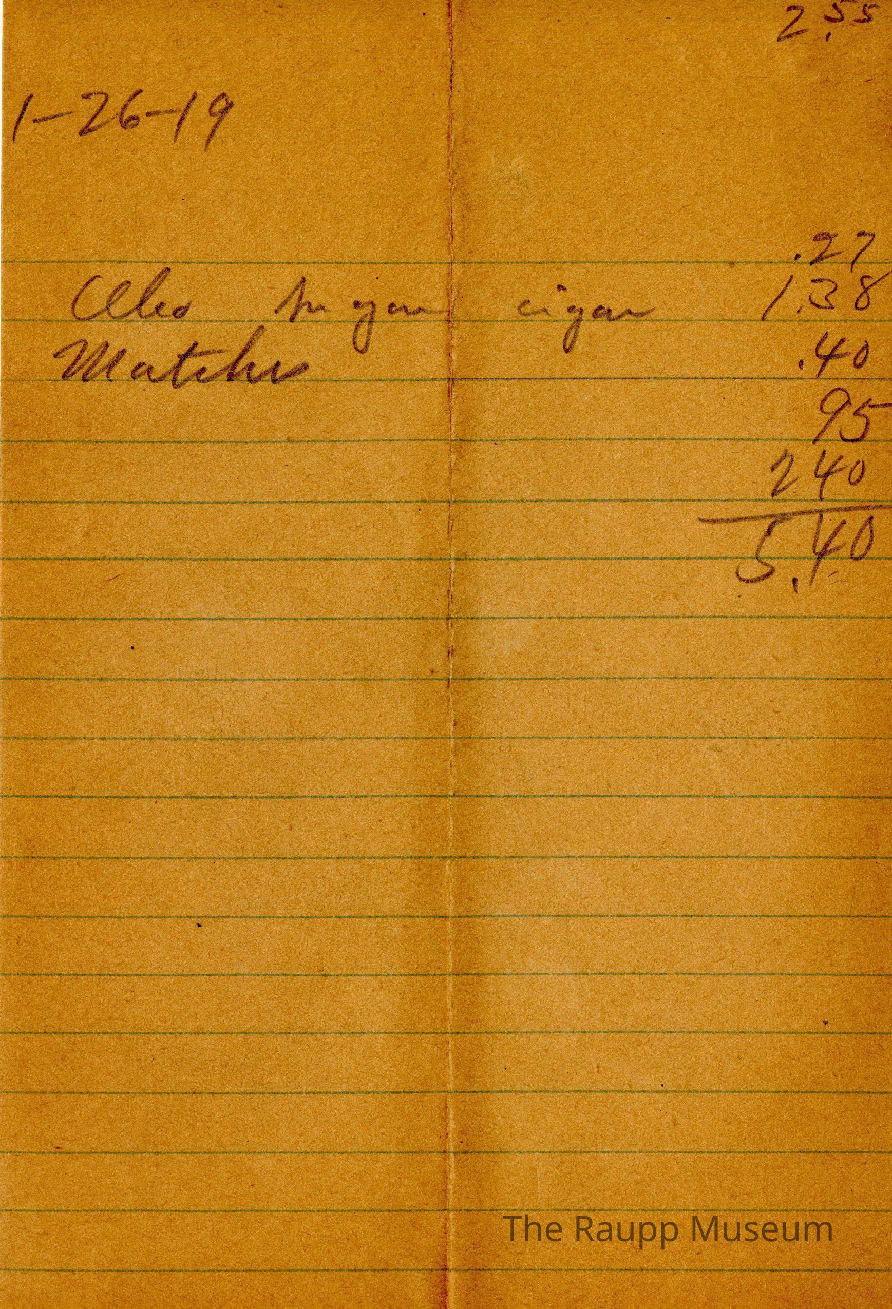 One (1) Firnbach and Raupp store receipt from January 26, 1919. Receipt is rectangular with handwritten text on a piece of paper with blue-print lines for writing. The paper lists various purchased merchandise and their prices. The things listed were oleo(?), cigars, matches, and an unknown item. The bill total being $5.40.