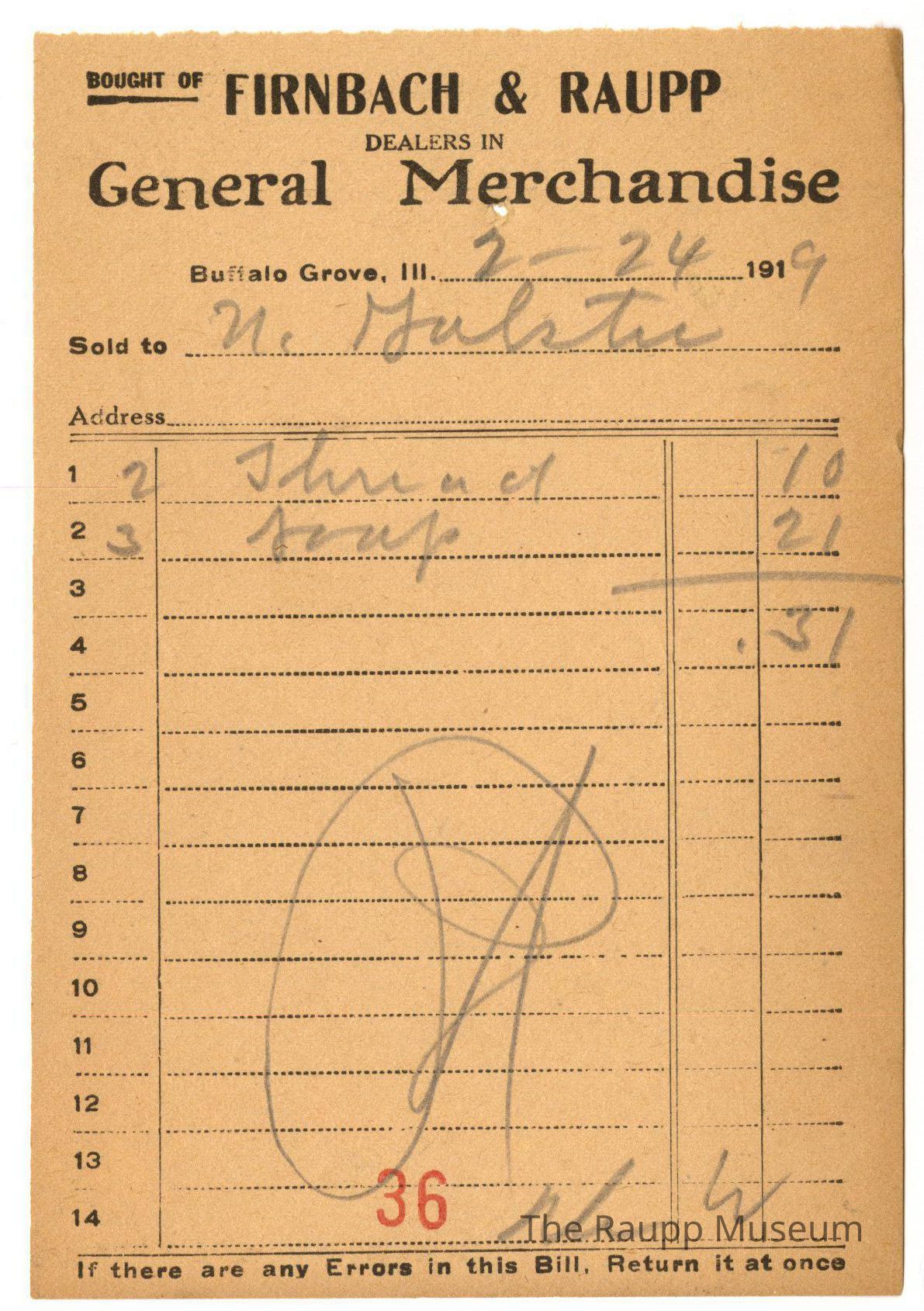 The black text is as follows, from top to bottom: "Bought of FIRNBACH AND RAUPP: Dealers in General Merchandise; Buffalo Grove , Ill.; Sold to; Address; If there are any Errors in this Bill, Return it at once."Archive Details