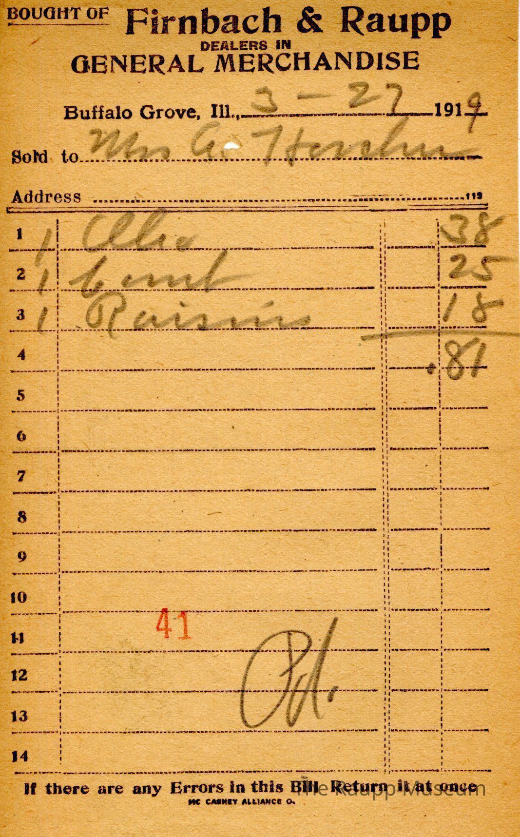 One (1) Firnbach and Raupp store receipt from March 27, 1919. Receipt is rectangular with black printed text and written notes in pencil. The receipt is for Mrs. G. Horcher, who bought 1 oleo for $0.38, 1 comb for $0.25, and 1 raisins for $0.18. Bill total was $0.81. The bill is marked as paid. There is a red "41" written at the bottom.